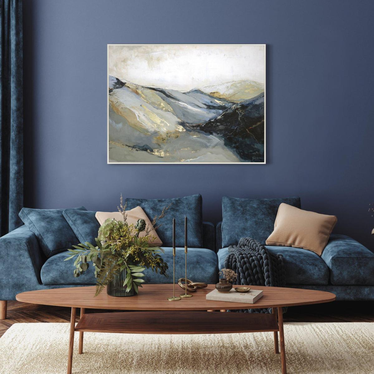 Witness the stunning abstraction of a rolling mountain range, where a stylish palette of deep blue, chalk white, and dove grey harmoniously assembles the highlands. Gold embellishments unfold, illuminating sections of the hillside, accentuating the terrain's texture and the play of light across the landscape. An extraordinary portrayal of nature's grandeur. Additional Information: Frame Width: 3cm Frame Colour:Pale grey Frame Material: Extruded Polyurethane and Pine Frame Dimensions: H:90 x W:120 x D:2.5cm Materials: PS, Canvas, Pine Assembly Required:Yes - Hanging Care Instructions:Dust the frame with a soft cloth or feather duster. Do not use glass cleaner as this could damage the frame finish.