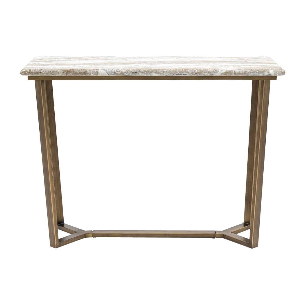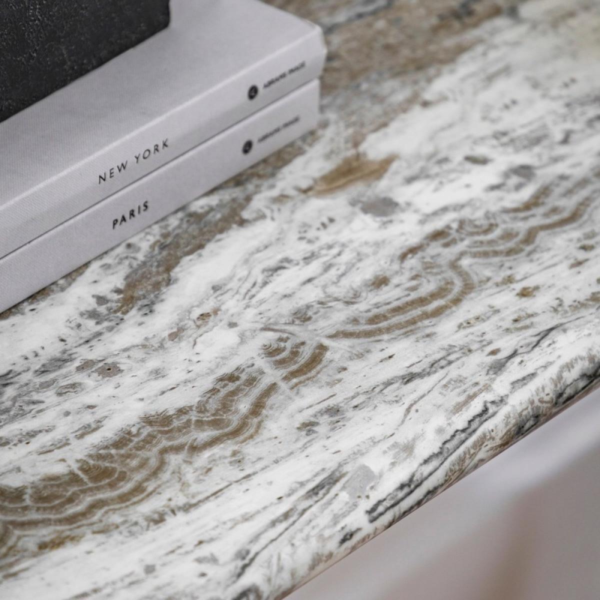 Add a touch of sophisticated elegance to a room with this lovely console table. The top features the most amazing green-grey marble faux finish which is created with the latest state of the art technology to give the look and feel of the real thing but without the weight and technical difficulties. The faux marble pairs beautifully with the metal legs and underframe which has a classy bronzed brass finish, to give an understated luxury style, perfect for any classic modern interior. Matching items also available. Additional Information