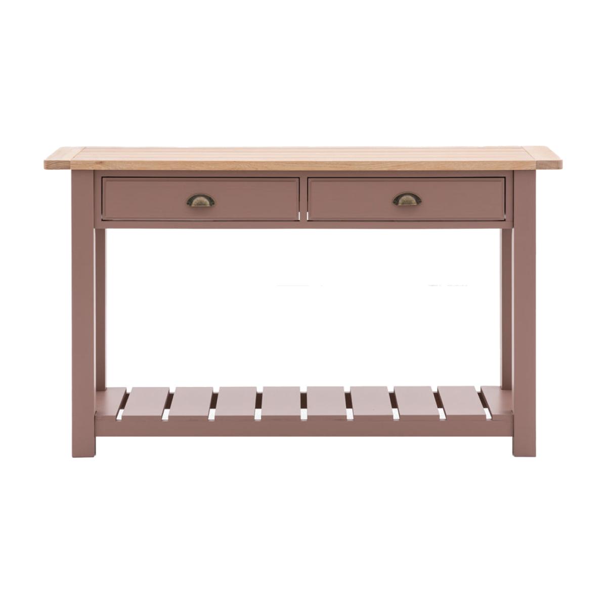 A modern update on a country classic, this console table is a versatile piece perfectly suited to both contemporary and rustic interiors. Featuring 2 drawers and a low shelf, the console table is perfect for living rooms, dining areas and kitchens alike, offering great additional storage. The hand painted subtly textured finish with metal drawer pulls and grooved & planked oak top add a modern twist to this country style console. Dimensions: H: 80 x W: 140 x D: 38 cm Materials: Oak, Pine, MDF Assembly Required:Yes Care Instructions: Clean with a soft dry cloth