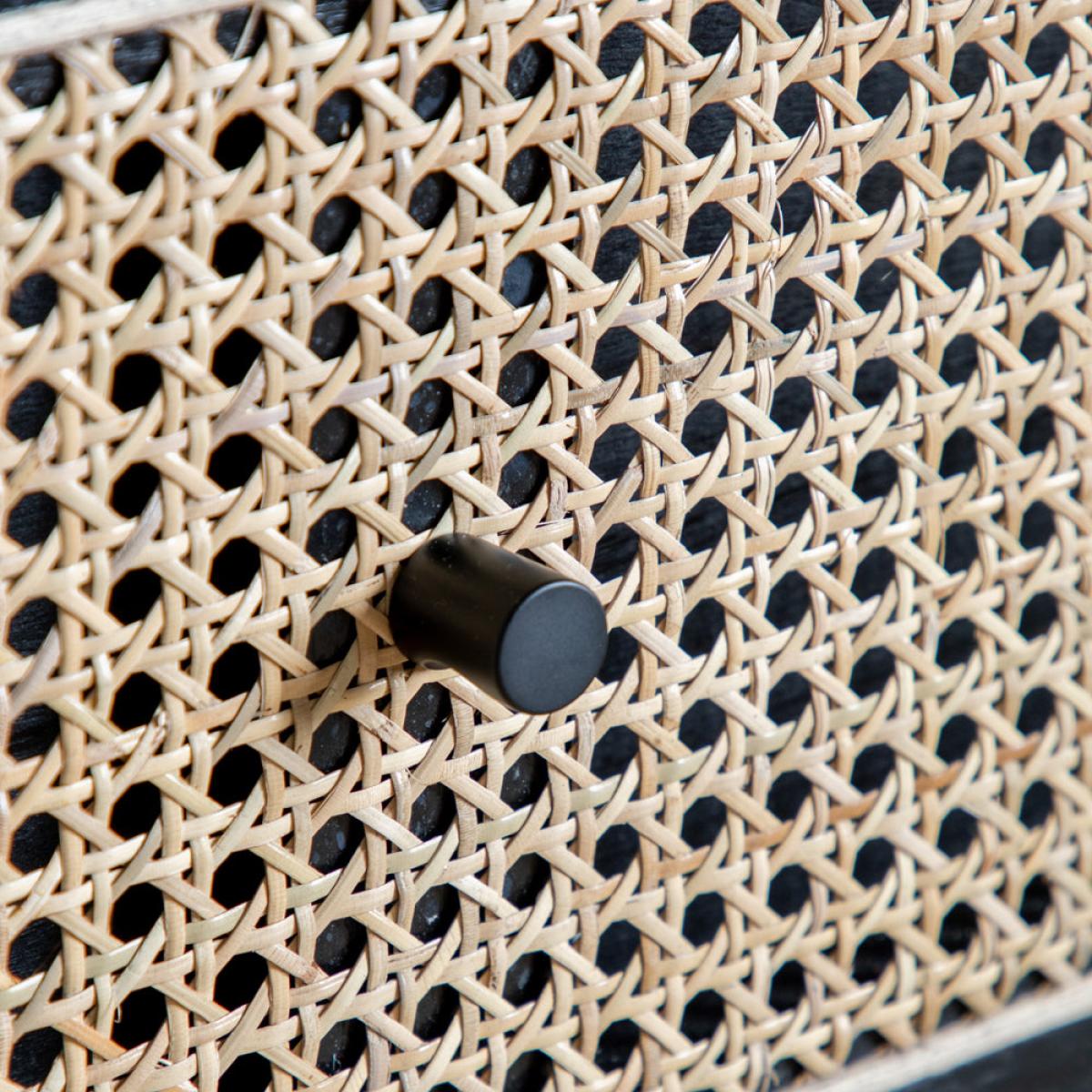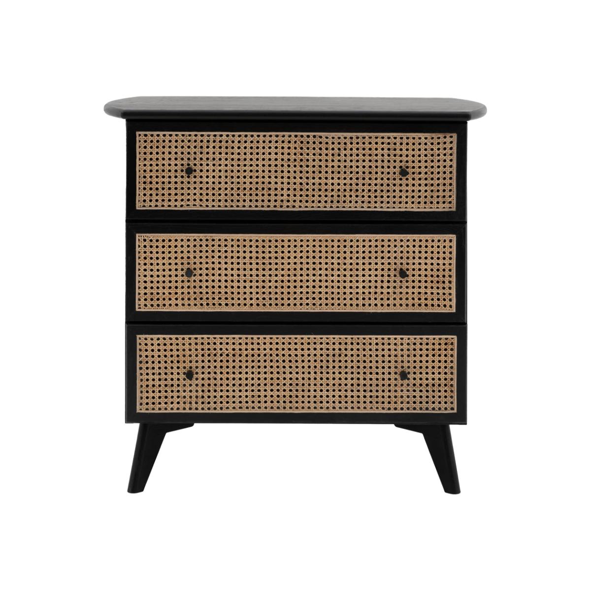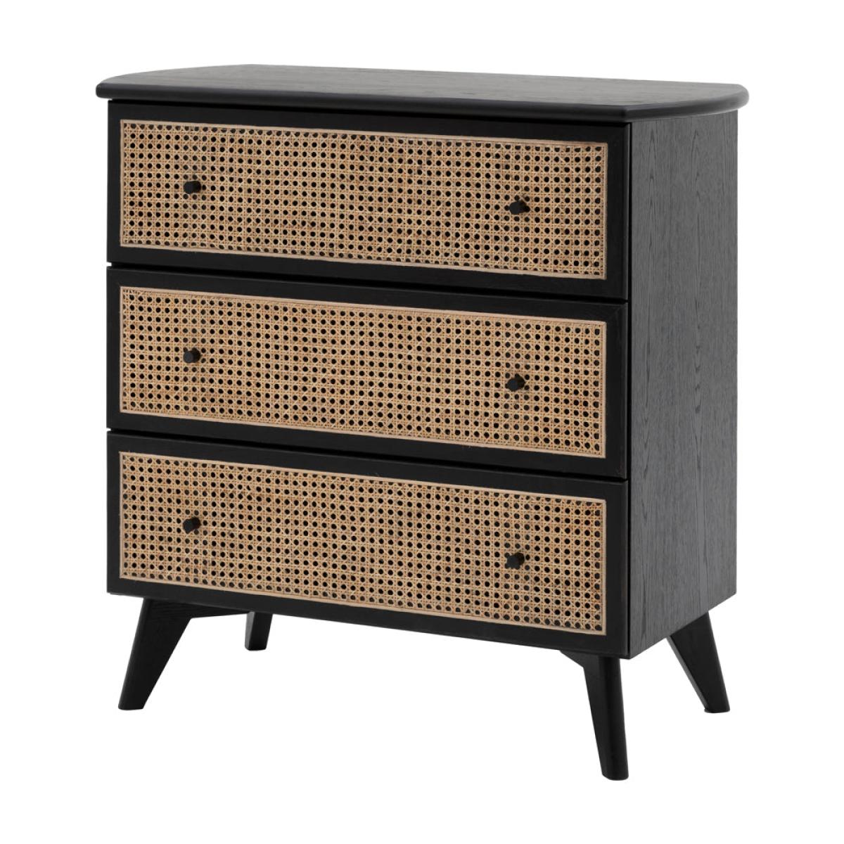 Dramatically stylish this 3 drawer chest combines practicality and statement style. Black stained solid oak & veneers create stunning contrast with the natural rattan woven drawer panels, creating piece of stand out bedroom furniture. With a hint of art deco glamour the simply shaped body and elegantly tapered legs let the contrasting materials speak for themselves. Dimensions: H: 87 x W: 90 x D: 45 cm Materials: Oak, Oak Veneer, Pine, Rattan Assembly Required:Leg / Foot Only Care Instructions: Clean with a soft dry cloth
