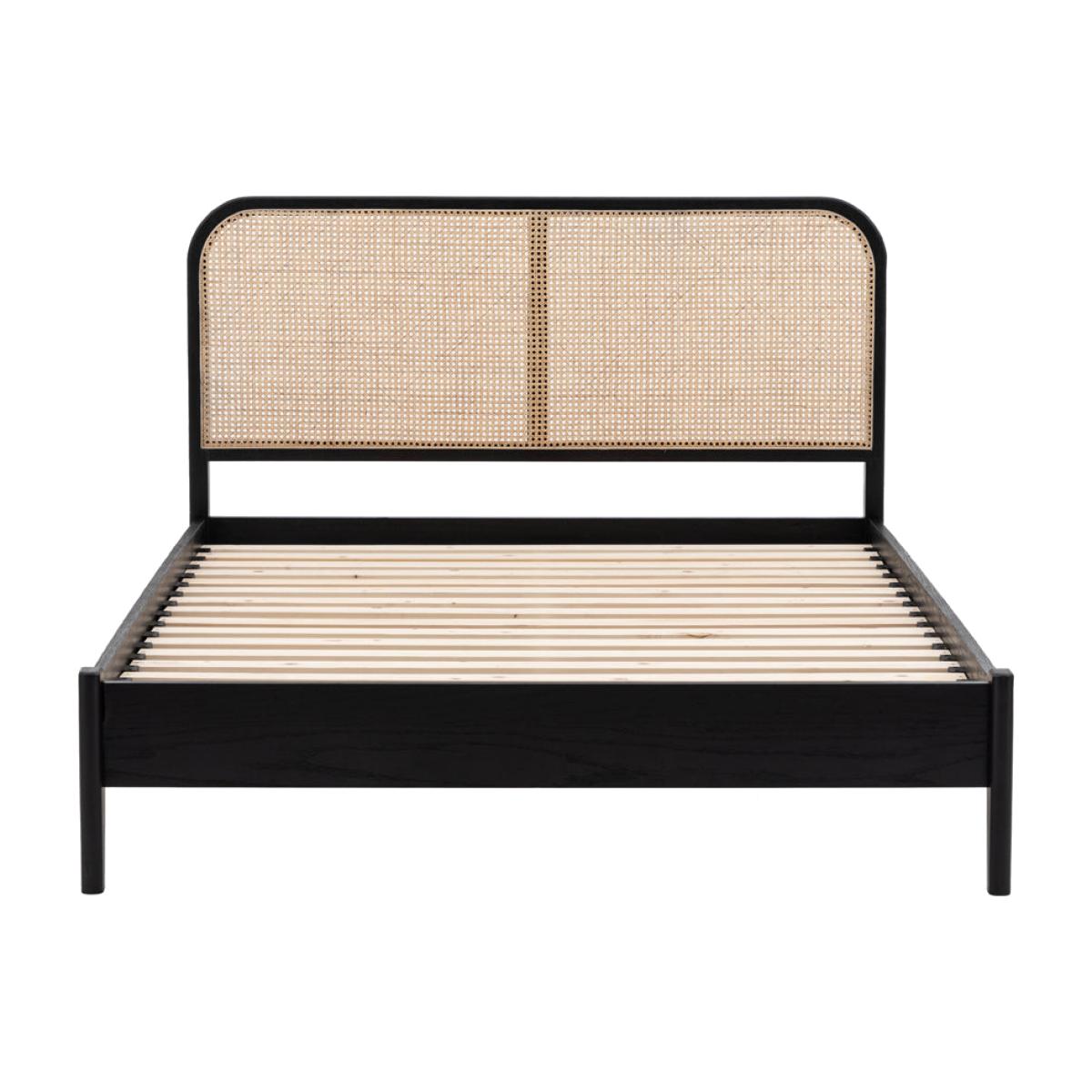 Dramatic statement style sure to become a modern classic. The solid black stand oak frame combines comfort and style ease, with curved corner headboard featuring a woven rattan panel creating a stunning stand out contrast of colours and materials. Available in 4'6" and 5" sizes. Dimensions: H: 109.5 x W: 144 x D: 204 cm Materials: Oak, Oak Veneer, Pine, Rattan Assembly Required:Yes Care Instructions: Clean with a soft dry cloth