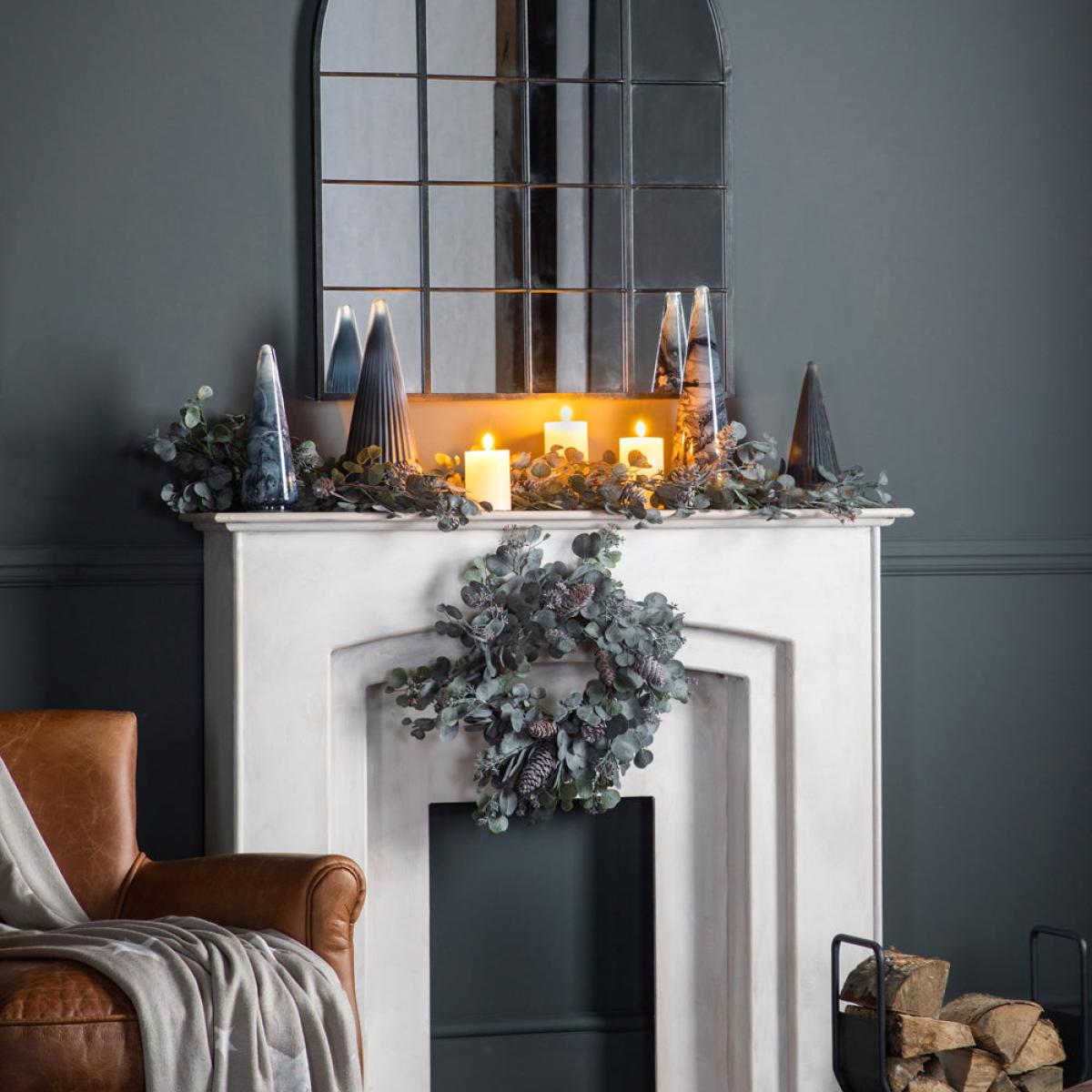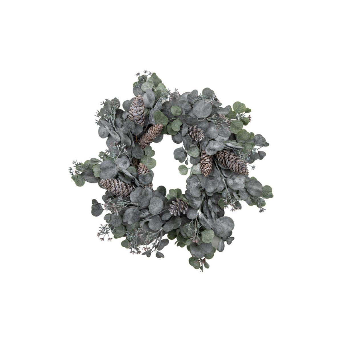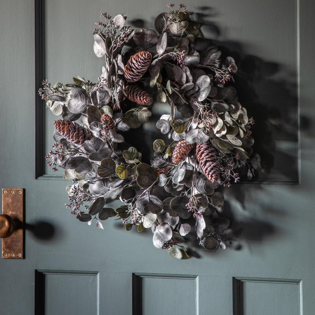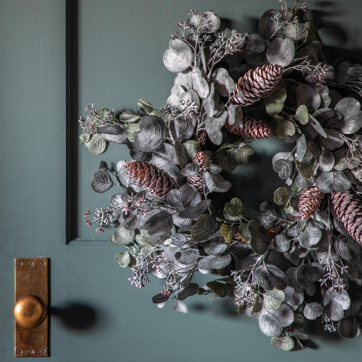 Whether you choose to hang it on a door or wall, or place it above a fireplace, this Seeded Eucalyptus Wreath with Cones will add the perfect festive touch to your space. The natural-looking leaves. View More. Whether you choose to hang it on a door or wall, or place it above a fireplace, this Seeded Eucalyptus Wreath with Cones will add the perfect festive touch to your space. The natural-looking leaves and cones give an organic yet welcoming feel, completing your holiday decorations with a natural finish. The green and brown tones will complement other décor in your space in a subtle way, working well with soft, warm lighting and both neutral and more striking colour schemes. This stylish round wreath is 50cm wide, 50cm high, and 11cm in depth, giving you a classic yet understated accompaniment to your festive decor.
