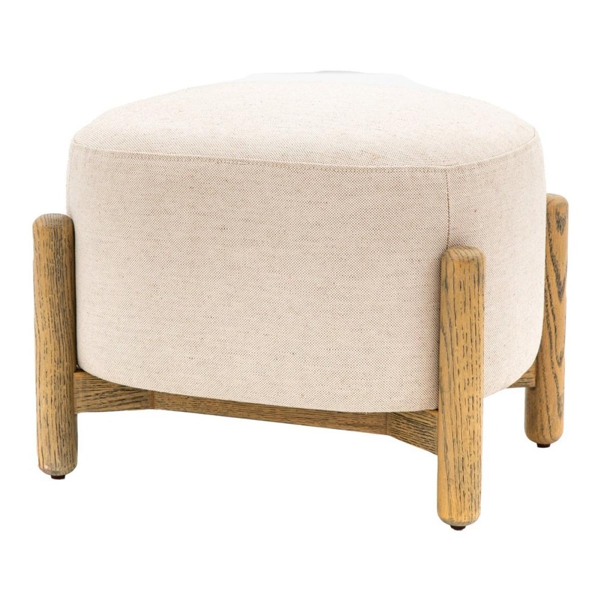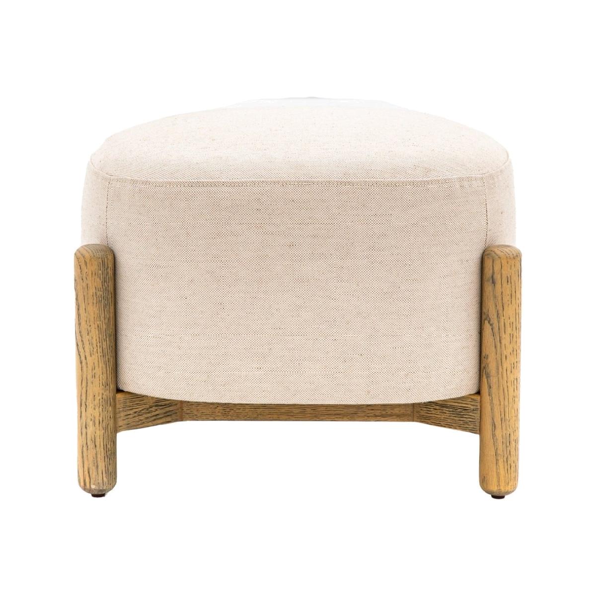 The eye-catching style of this lovely footstool features a beautifully designed wooden base which supports a deep cushion, upholstered in a lovely natural coloured fabric. It is also available in an vintage-style brown leather and matching armchairs are available. Additional Information