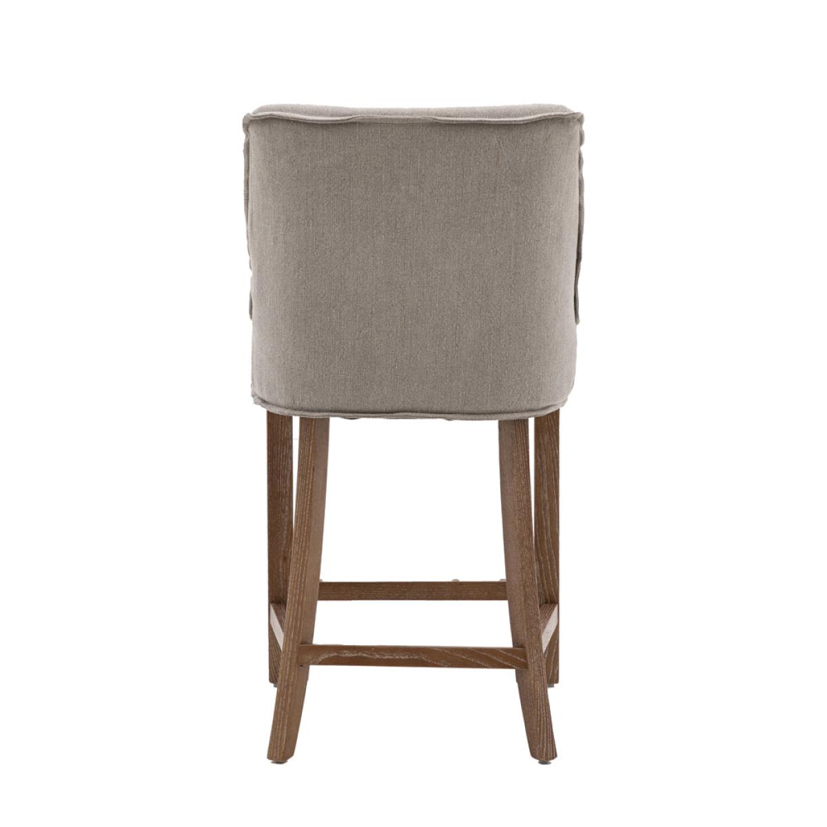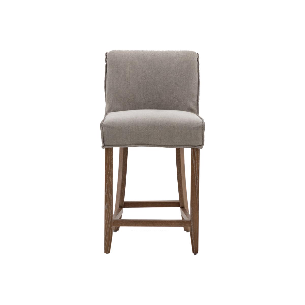 Soft and chic set of 2 bar stools designed to suit a range of interiors with ease. They would look equally at home in modern or vintage spaces. Upholstered in cement grey linen and finished with softly angled wood legs. Dimensions: H: 95 x W: 49 x D: 59 cm Materials: Oak, Plywood, Polyester, Foam, Polyfibre Assembly Required: Leg / Foot Only Care Instructions: Spot clean only. No harsh abrasives or cleaners