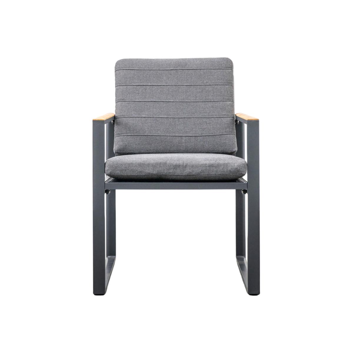 I love this set of outdoor chairs for their sleek, contemporary look that works well in both modern and minimalist garden settings. The charcoal colour makes them versatile and easy to coordinate with other outdoor furniture or greenery, creating a cohesive aesthetic. For styling tips, pair them with light-toned cushions or throws for a touch of softness, or go bold with patterned textiles to add visual interest. These chairs are practical too - their sturdy frame and comfortable padding make them ideal for outdoor dining or lounging, especially when complemented with a matching table or surrounded by lush plants and statement planters to create a welcoming al fresco space.