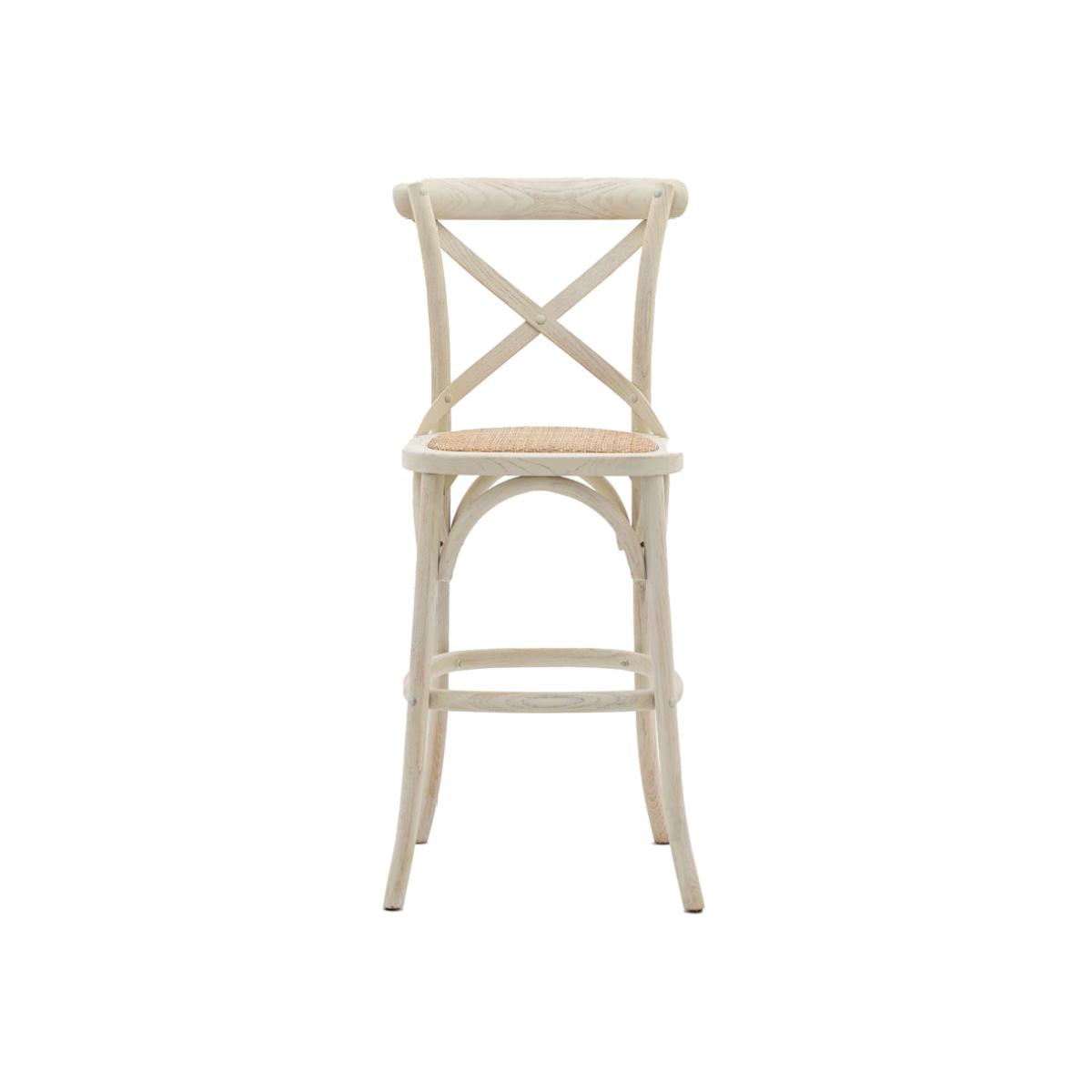 Set of 2 French bistro style bar stools. Perfect for enjoying your morning coffee and croissants. With an elegant cross back design, curved leg detail, solid rattan frames and hand woven rattan, perfect for bringing a little French cafe touch to your home. Dimensions: H: 101 x W: 45 x D: 50 cm Materials: Oak, Plywood, Rattan Assembly Required: No Care Instructions: Spot clean only. No harsh abrasives or cleaners