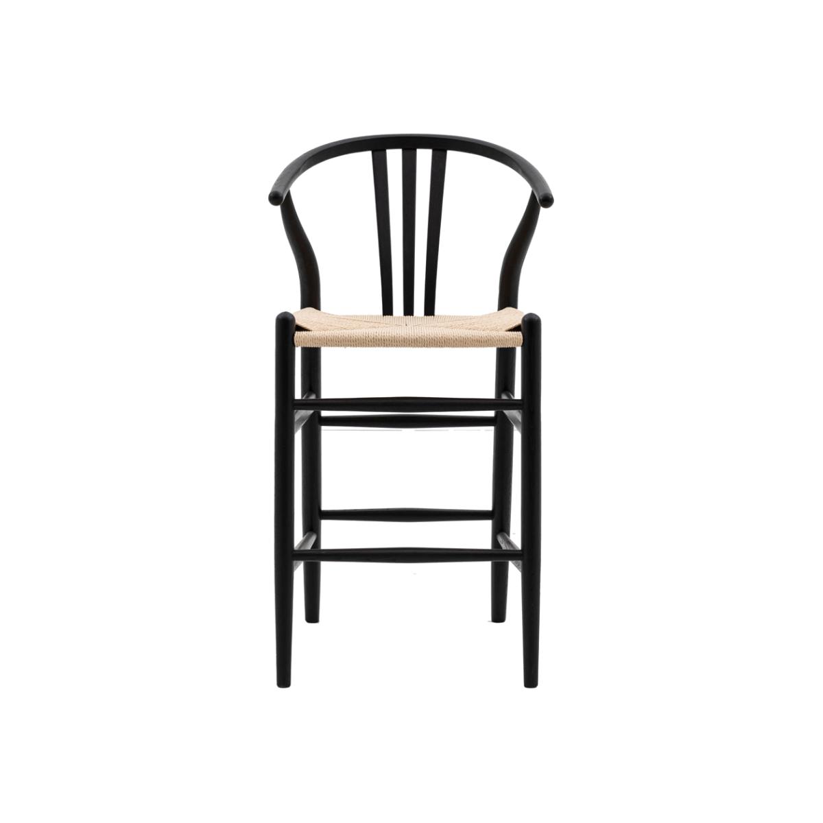 Set of 2 stand out wishbone back bar stools, perfect for modern or vintage inspired kitchens and dining spaces. A contemporary twist on a classic design, this bar stool features elegant sleek lines, a deeply curved back and a distinctive hand woven seat. Dimensions: H: 98 x W: 41 x D: 47 cm Materials: Elm, Kraft Paper Assembly Required: No Care Instructions: Clean with a soft dry cloth