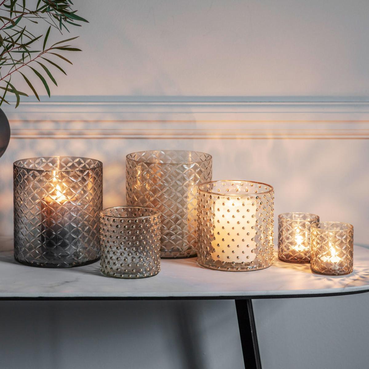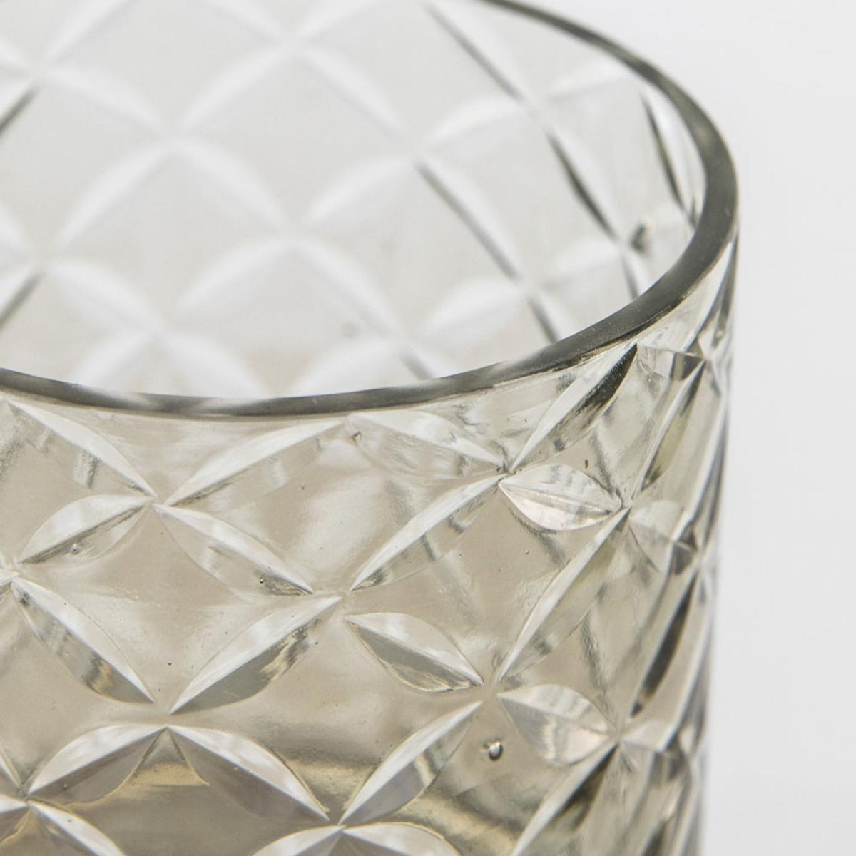 This lovely tealight holder is handmade from smoked grey glass with a cut glass design which adds interest and creates beautiful patterns when a lit tealight is placed inside. Dimensions: H: 8 x W. View More. This lovely tealight holder is handmade from smoked grey glass with a cut glass design which adds interest and creates beautiful patterns when a lit tealight is placed inside.