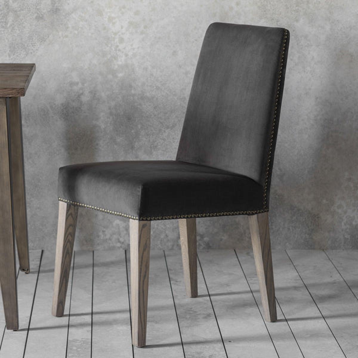 These gorgeous dining chairs are available as a set of two. They are plush and comfortable to sit on, ideal for use when hosting a dinner party. They have been upholstered to perfection in a stunning shade of midnight blue velvet. The Rex dining chairs feature a long slender back which supports good posture and makes them look sophisticated and stylish. These chairs feature metal studs surrounding the base of the seat and back of the chair, adding another element of visual interest. They stand on elegantly tapered legs crafted from wood in a dark shade that perfectly complements the velvet chair. Outlet items may show some signs of minor cosmetic imperfections Dimensions: W:46 x D:59 x H:91 cm Materials: Ash, Linen Seat Height: 49cm Assembly Required: No