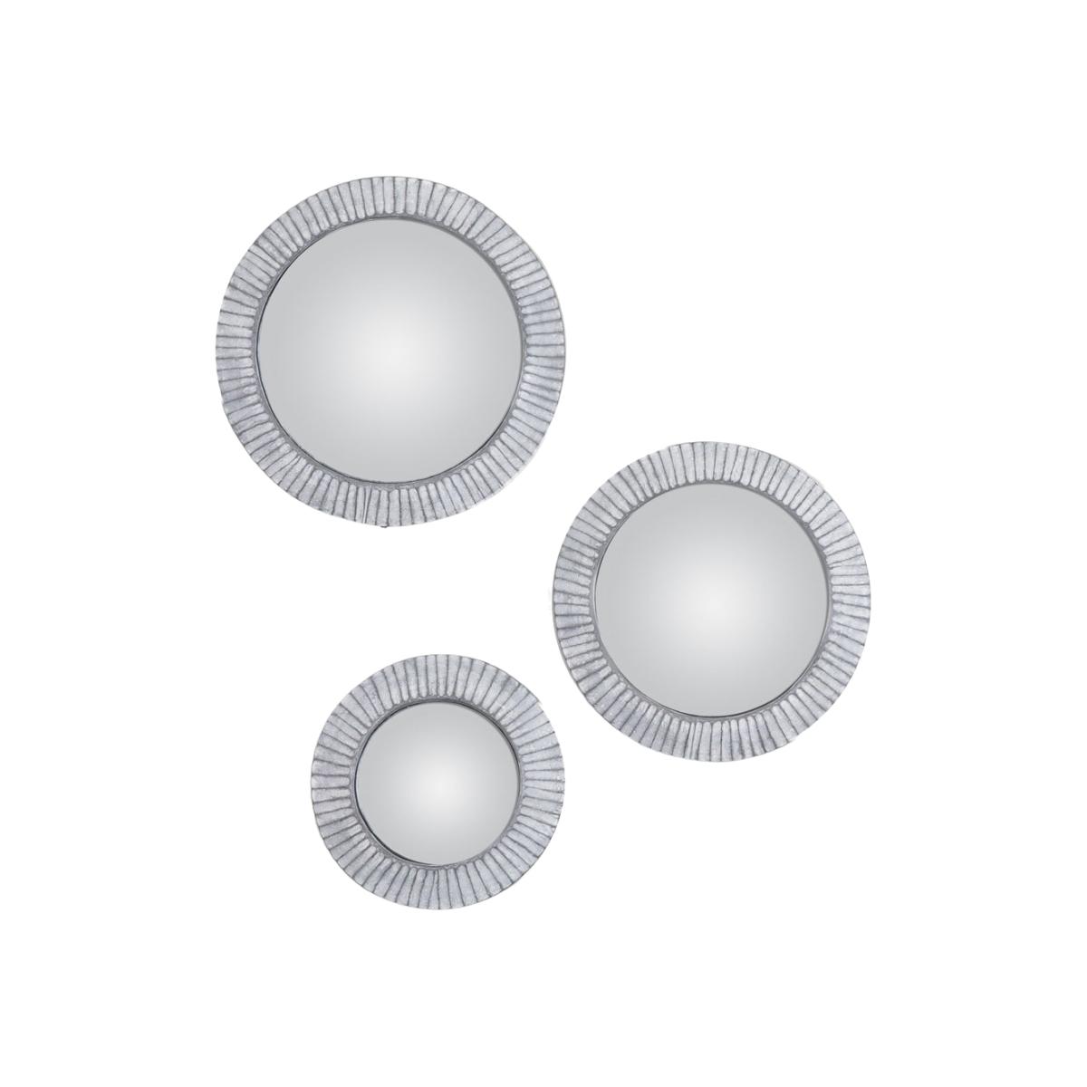This stylish set of three mirrors will make an interesting feature to any living space, bedroom or hallway. The set features three mirrors of different sizes. Each are circular in shape and they all have ornate silver metal edging, which provides a great focal point. They feature a frame made of resin, and they have a modern grey wash finish design. This makes them look interesting, but they are neutrally coloured enough to fit in with any existing décor in your home. Place these together to make a single feature or separate them to create a theme that runs throughout your home. Dimensions: H: 27 x W: 27 x D: 3.5 cm Materials: Polyresin / Mirror Glass Assembly Required