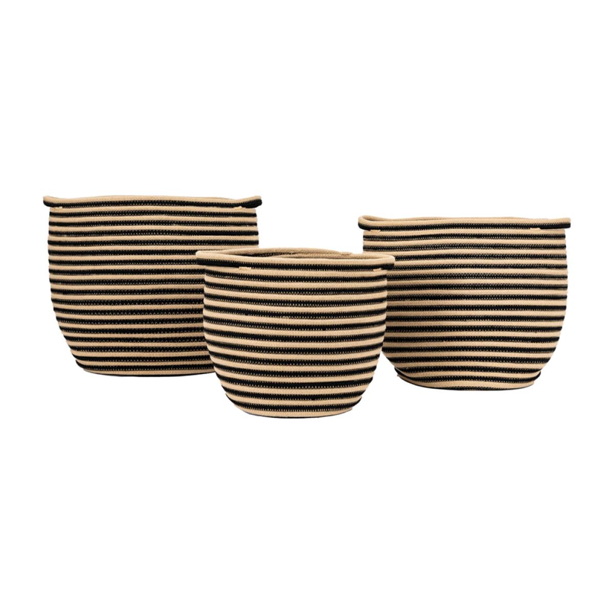 The bold black and natural stripe pattern of these basket offer stand out style. Woven from polyester with easy use carry handles, the set of 2 baskets are great storage or planters for faux plants. Dimensions: Small - H: 27 x W: 23 x D: 23 Medium - H: 33 x W: 27 x D: 27 cm Large - H: 37 x W: 33 x D: 33 cm Materials: Polyester Assembly Required: No Care Instructions:Dust with a soft, lint free, clean cloth