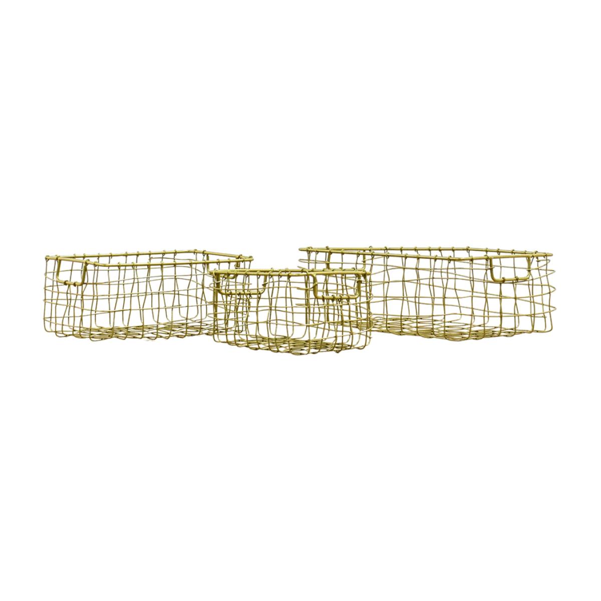 Cute set of three baskets which offer a great desktop storage solution. They are handmade with an antique brass wire finish.