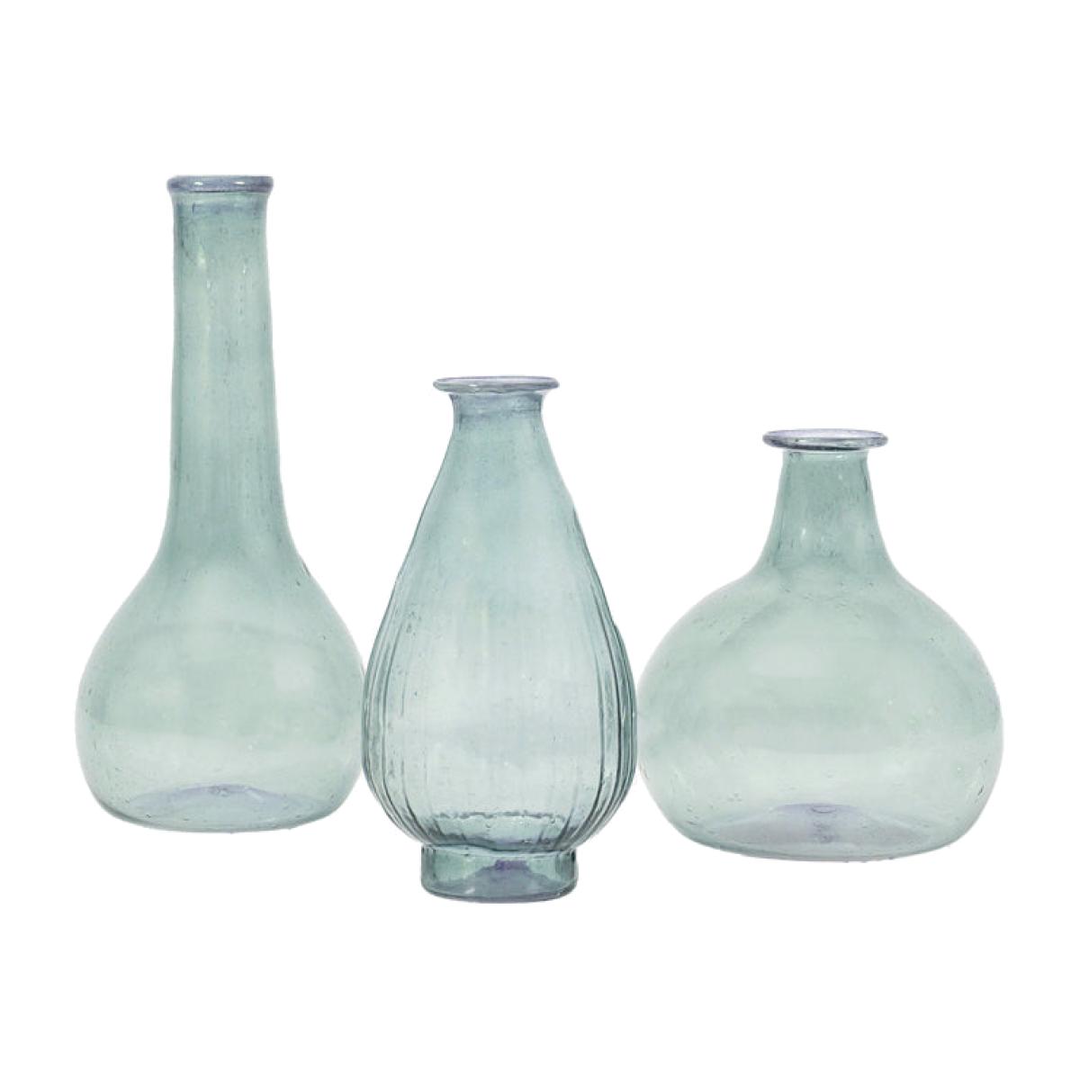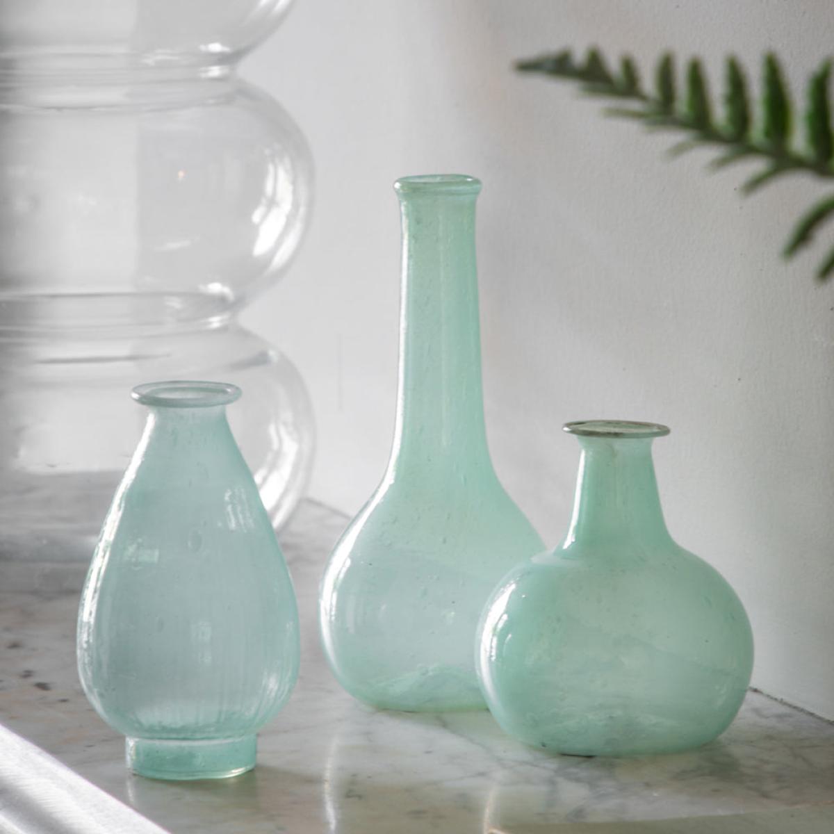 Handmade in icy blue brown glass, this set of 3 vases, with their rounded organic shapes feels beautifully retro and stylish, each piece is truly unique. Coordinating vases available to mix and match. Dimensions: Small - H: 11 x W: 9 x D: 9 cm Medium - H: 12 x W: 7 x D: 7 cm Large - H: 17 x W: 8 x D: 8 cm Materials: Glass Assembly Required: No Care Instructions:Dust with a soft, lint free, clean cloth