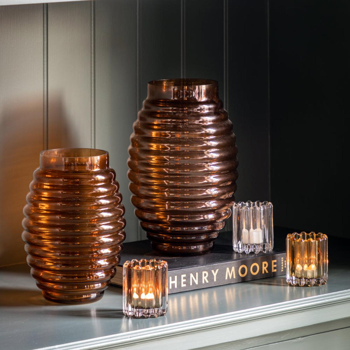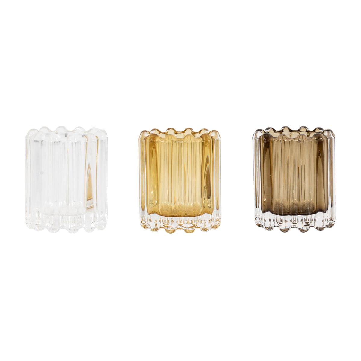 Set of 3 charming glass tealight holders in clear, ochre and smoked brown which create a lovely ombre fade effect when placed together. Adding a warm glow to any space, each tealight holder is heavily ridged. Tealights not included. Dimensions: H: 7.5 x W: 6.5 x D: 6.5 cm Materials: Glass Assembly Required: No Care Instructions: Dust with a soft, lint free, clean cloth