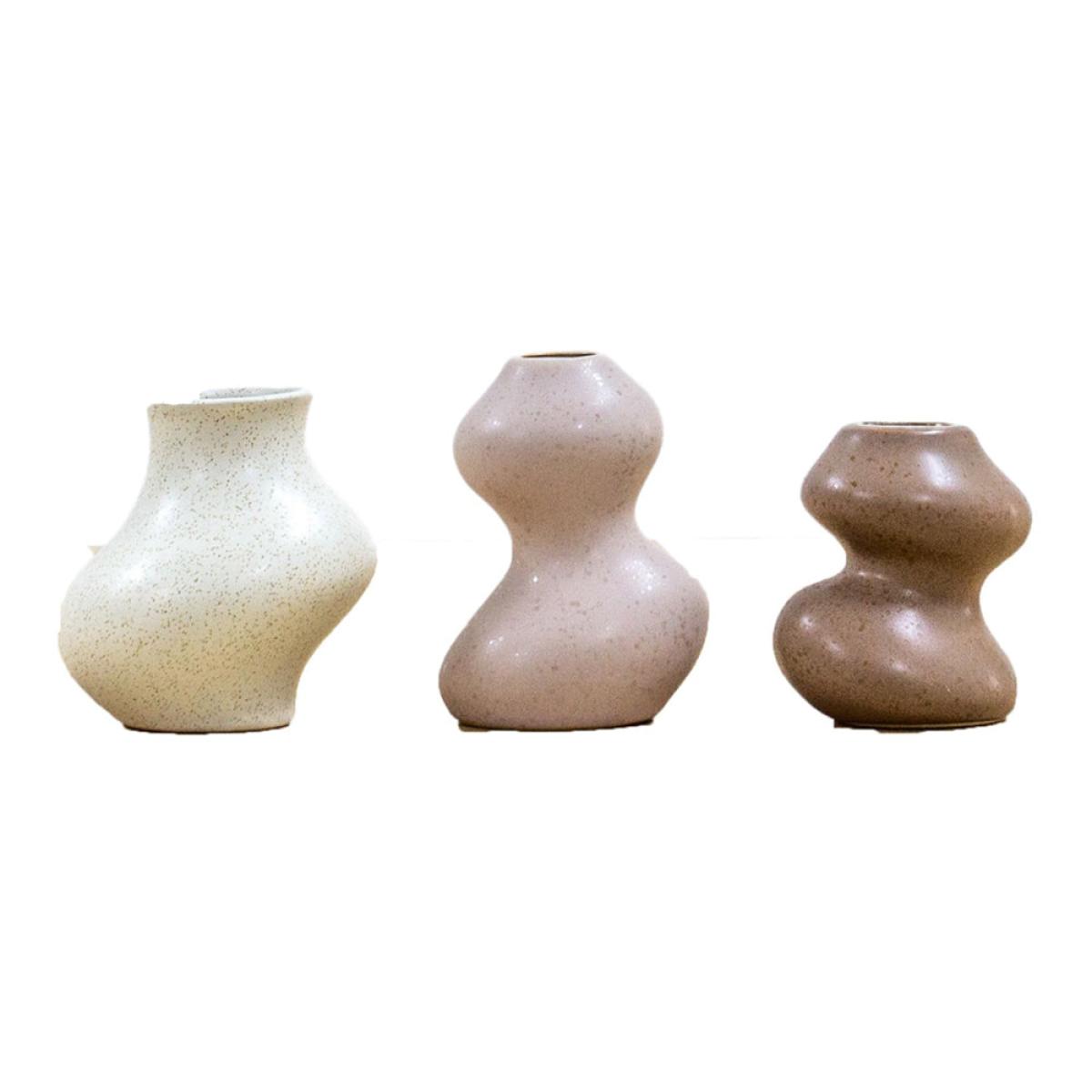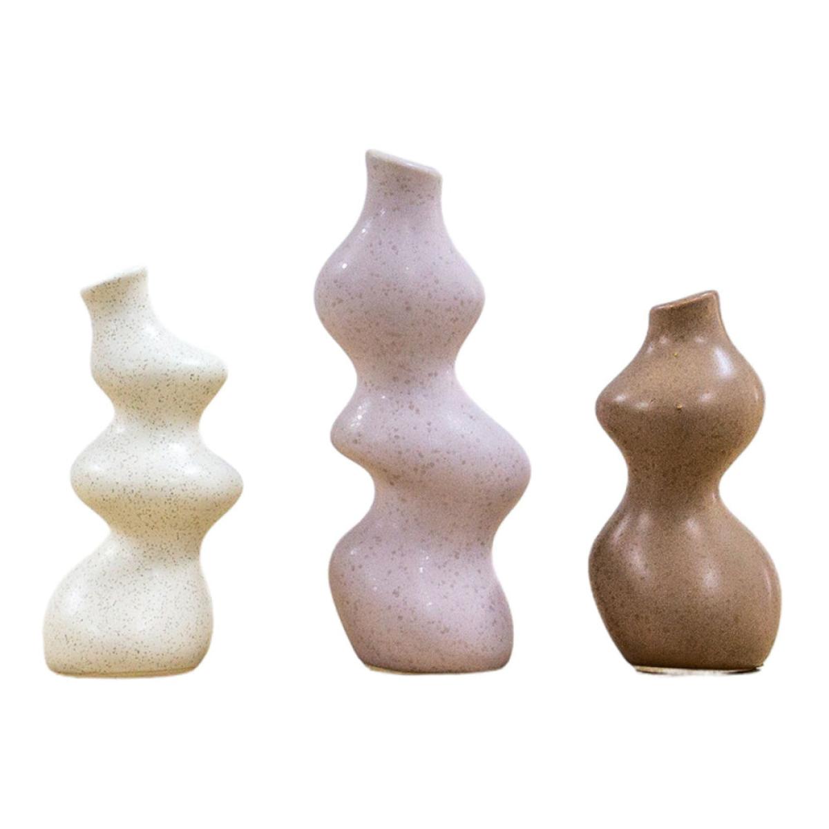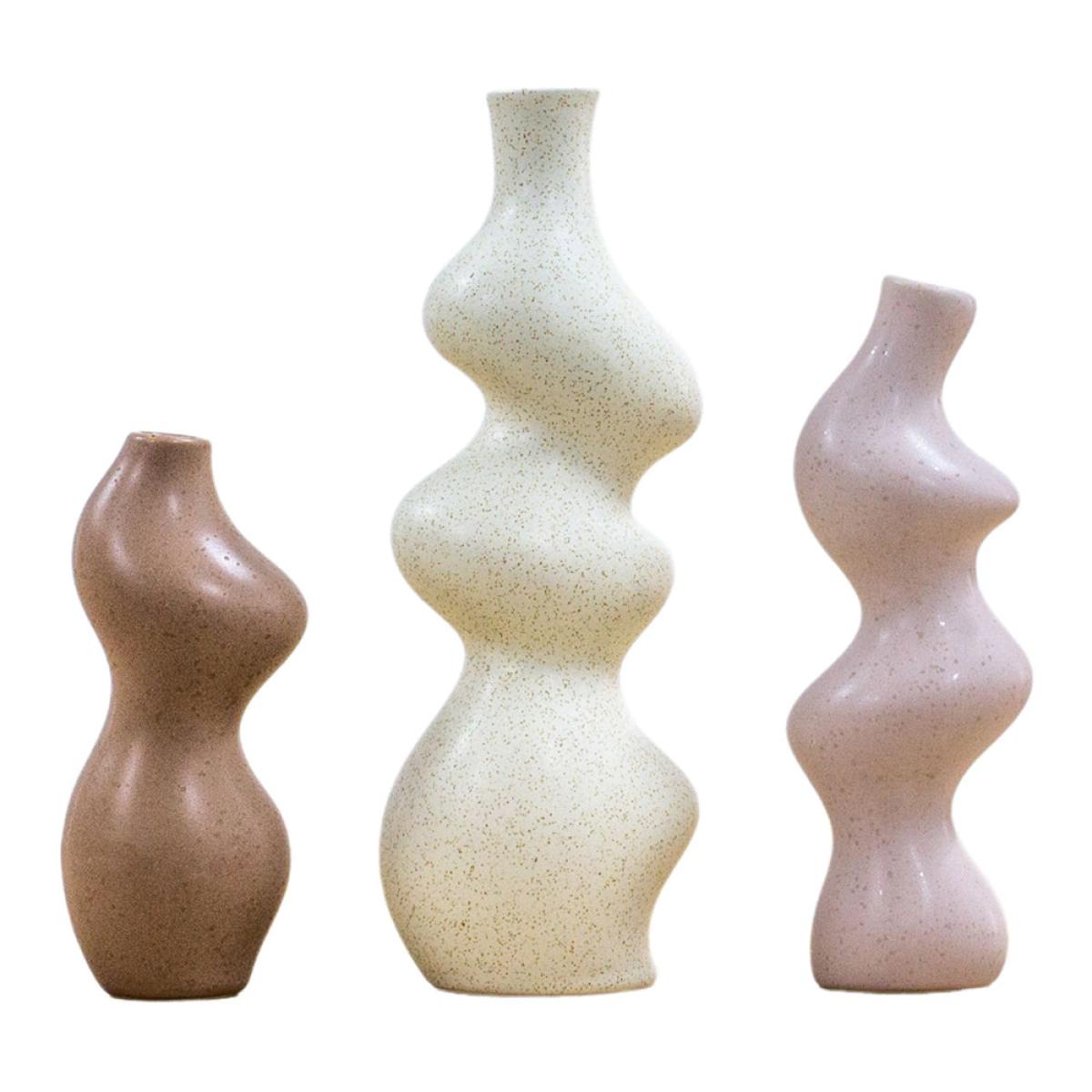 This quirky set of three vases adds a touch of fun and character to a room. The three shapes, in their coordinating tones, fit together. They have tonal blue matt glazes. Two smaller sets are avail. View More. This quirky set of three vases adds a touch of fun and character to a room. The three shapes, in their coordinating tones, fit together. They have tonal blue matt glazes. Two smaller sets are available, and all three sizes are also offered in neutral tones.