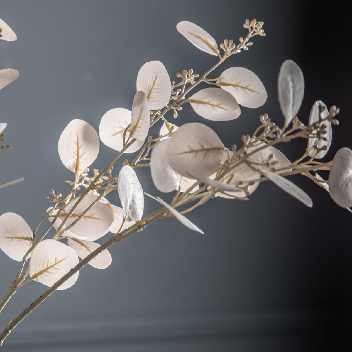 Eucalyptus spray with a lovely twist, featuring a beautiful dry look and finished in a lovely white colour, perfect for displaying on its own or added to one of our faux bundles. Dimensions: W: 22 x D: 10 x H: 83 cm Materials: PE, Iron, Paper Assembly Required: No Care Instructions:Dust with a clean, lint free cloth. No harsh abrasives or bleach