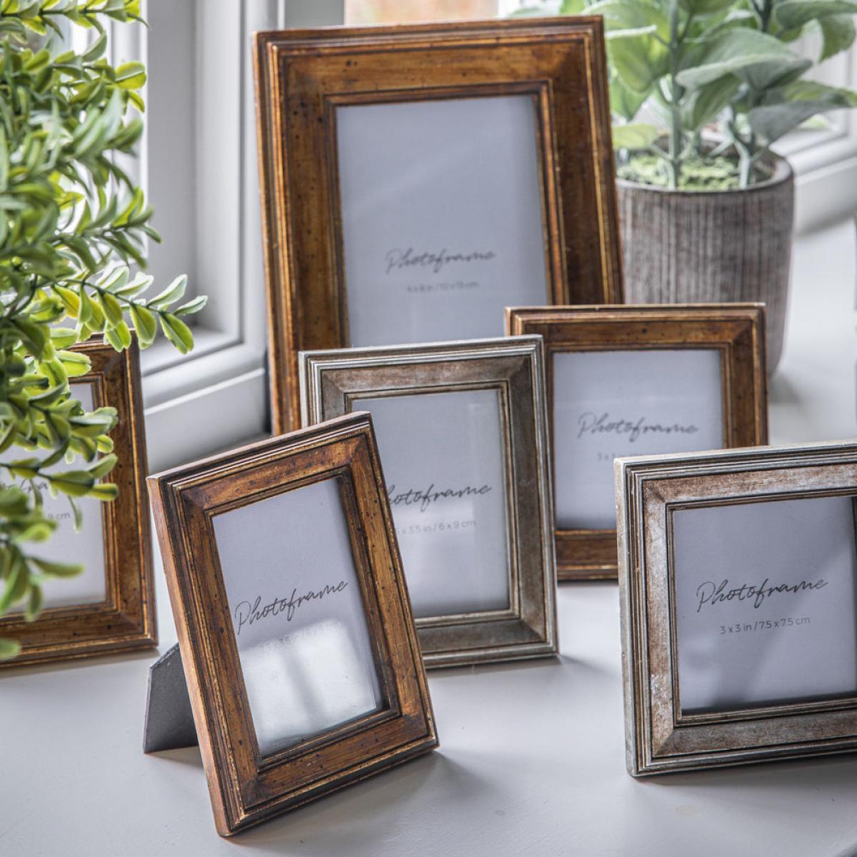 Keep the best memories on display by putting your favourite photos in one of these beautiful Sonam photo frames from Gallery Interiors. The Sonam has a lovely antique bronze finish and takes 4 x 6. View More. Keep the best memories on display by putting your favourite photos in one of these beautiful Sonam photo frames from Gallery Interiors. The Sonam has a lovely antique bronze finish and takes 4 x 6 inch photos. This is perfect for creating a lovely display so you can remember happy days with friends, family, children or pets. The frames are available in a range of sizes, with the smallest frame measuring 10. 9cms long, 10. 9cms wide and 1. 7 cms deep, the next size measuring 21. 5cms long, 16. 5cms wide and 2. 1cms deep, and the large size measuring 24cms long, 19. 5cms wide and 2. 1cms deep.