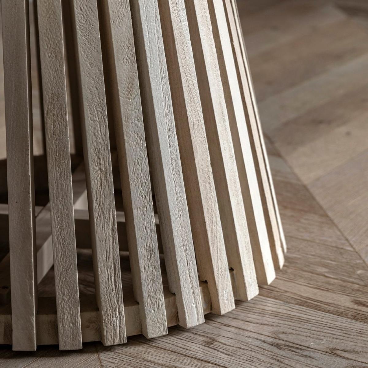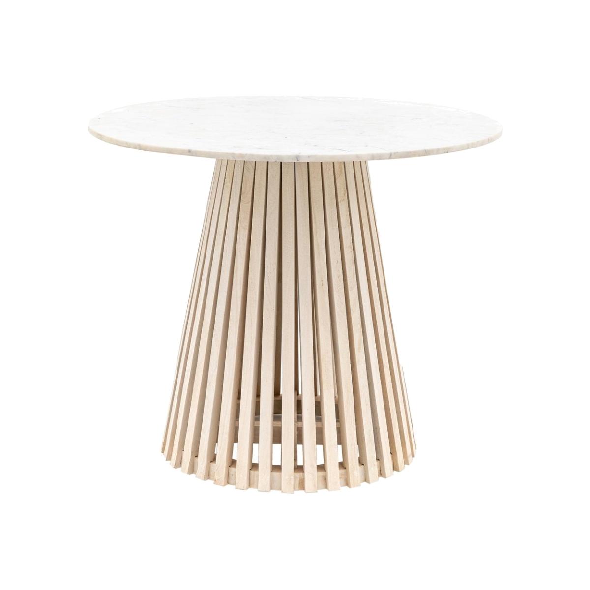 This lovely round dining table offers stylish contemporary design. The base is crafted from gently sloping slats of mango solid timbers with a white-washed, sand-blasted finish to create a striking design feature. This stunning base is paired with a beautiful white Indian marble top, creating a classy, elegant piece of furniture. Matching items are available. Additional Information