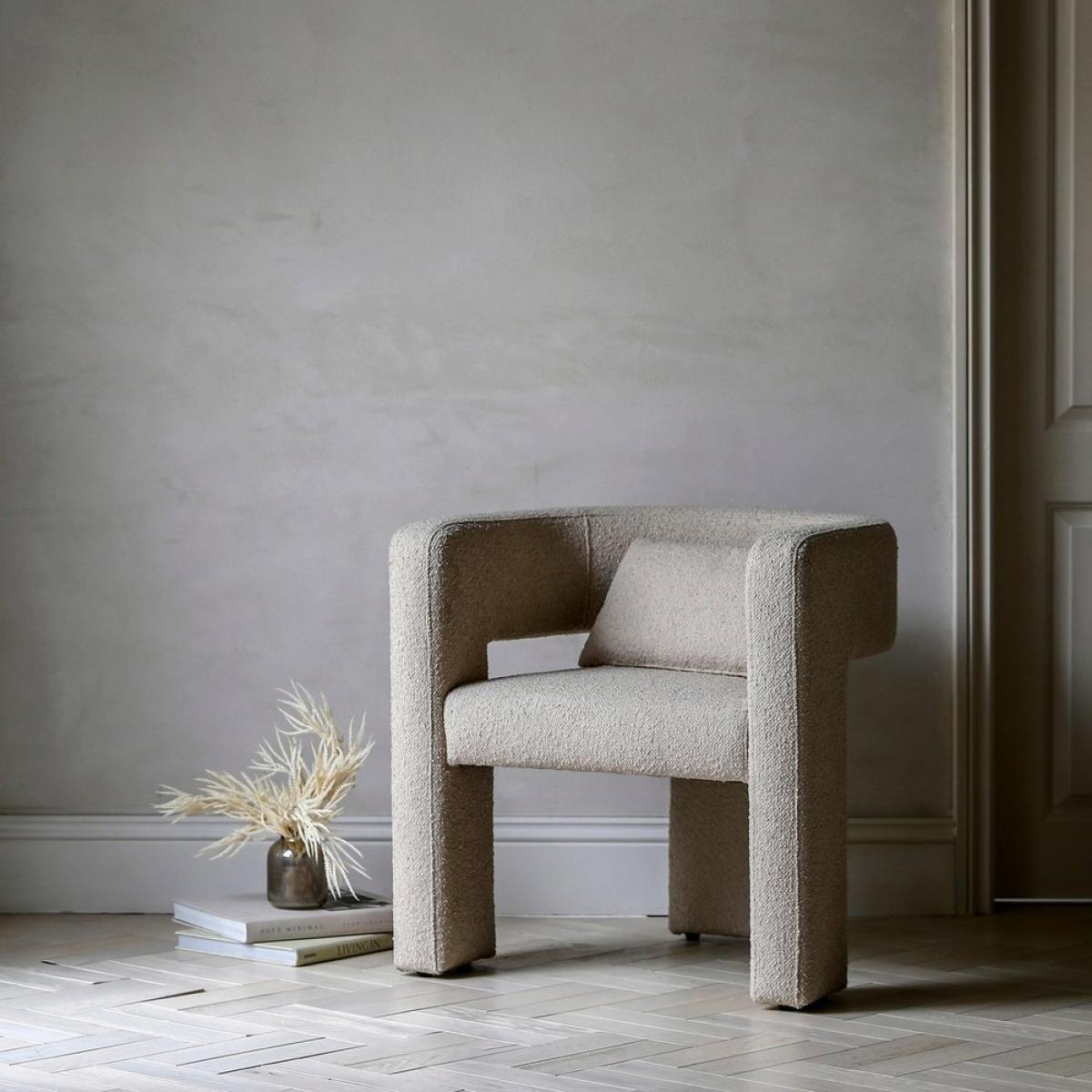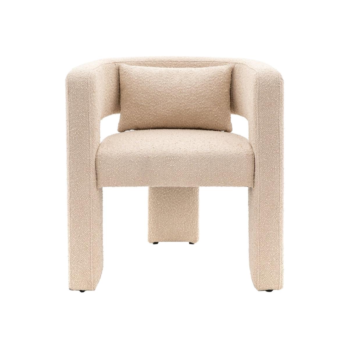 This eye-catching occasional chair adds a stunning, bold design touch to a room. It is fully upholstered in a lovely neutral fabric, with a bolster cushion for added comfort. Additional Information: Seat Width between arms: 49cm Clearance to Floor: 34cm Leg Height: 34cm Dimensions:H:78.5 x W:69 x D:64cm Materials: Solid Oak 35% / Plywood 25% / Polyester 25% / Foam 13% / Poly Polyfibre 2% Assembly Required:Yes Care Instructions:Wipe clean with a soft dry cloth - no harsh abrasives
