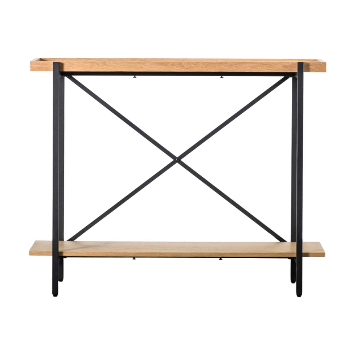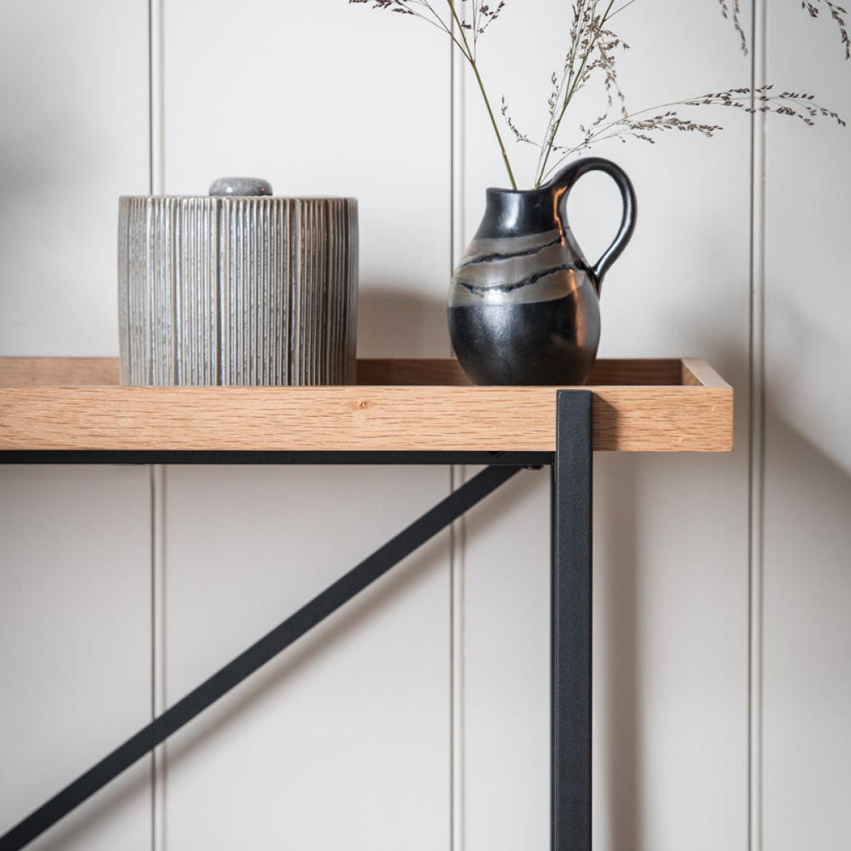 Offering a stunning contemporary look, this console table combines matt black metal with oak. The table top and shelf are tray-style with oak veneer tops and solid oak surrounds. Matching pieces are available. It is part of our Packed-Flat Design Project, offering easy delivery to any room in any property, whilst reducing the packaging needed. Easy assembly is required, but all the tools needed are supplied. Additional Information