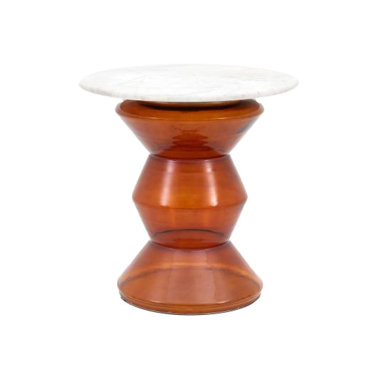 Bold and beautiful, this stunning side table is definitely an eye-catching piece of furniture. The shaped orange glass base is topped by a luxe white marble top with a bronze toned metal collar, creating a stand-out table designed to add a bit of luxury to your room. Also available with an clear glass base. Dimensions:H:51 x W:51 x D:51cm Materials: Glass 50% / Marble 30% / Aluminium 20% Assembly Required:Yes Care Instructions:Wipe clean with a soft dry cloth - no harsh abrasives