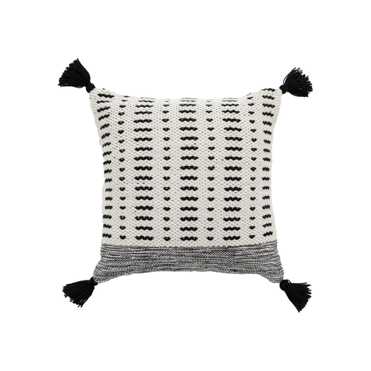 Perfect for adding some style and cosiness to your room, this cushion cover features a unique textured design in black, grey and white. The soft textured fabric is finished off with a black tassel at each corner. Cushion pads sold separately, allowing you to choose from feather-filled or polyester. Dimensions: H: 1 x W: 45 x D: 45 cm Materials: 100% PET Assembly Required: No Care Instructions: Spot clean only. No harsh abrasives or cleaners. Do not hand or machine wash, tumble dry, bleach, dry clean or iron