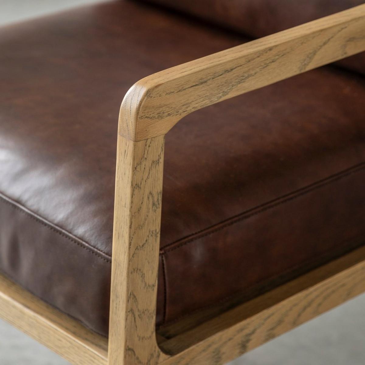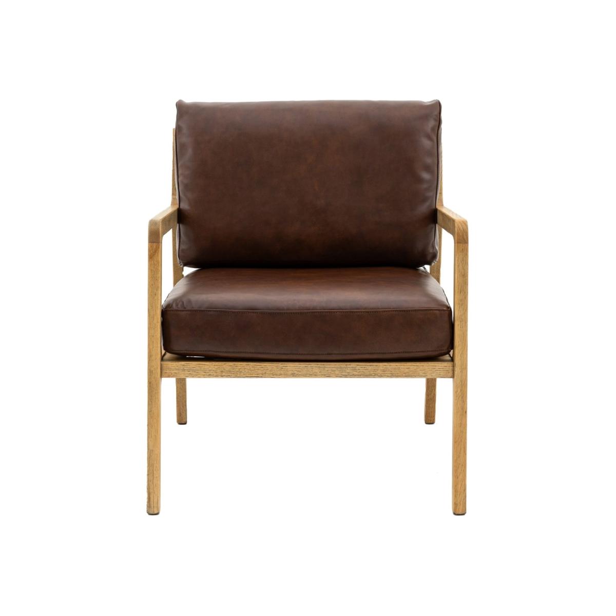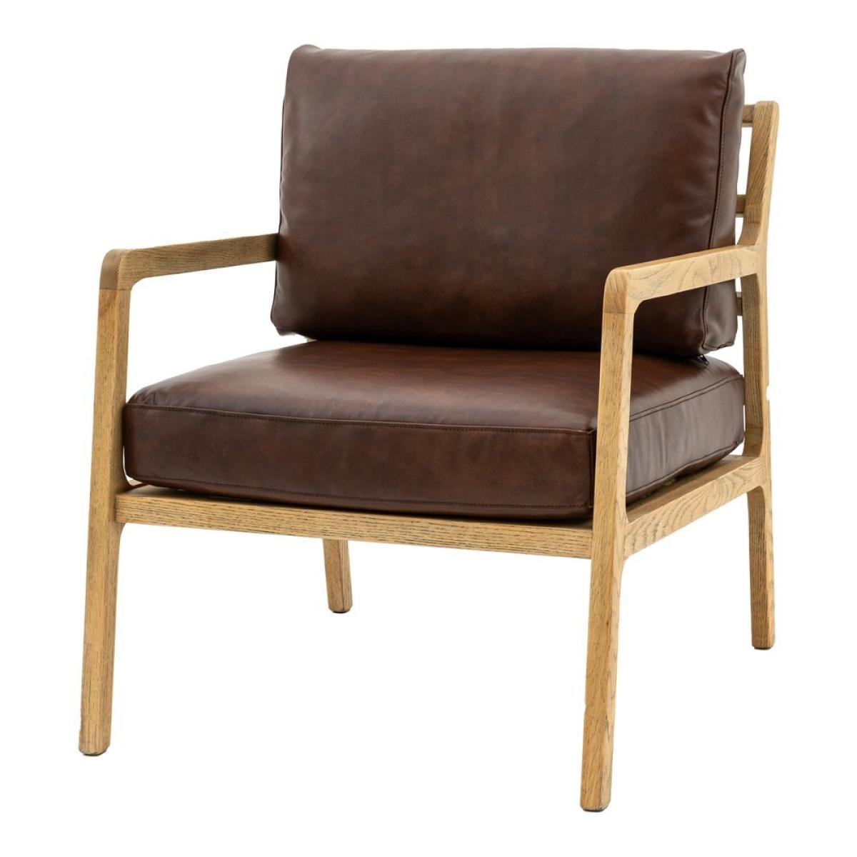 This lovely occasional chair offers a touch of retro style and would look at home in a wide range of interiors. The seat and back cushions are upholstered in brown leather, which pairs beautifully with the wooden frame. Additional Information: Seat Width between arms: 62cm Clearance to Floor: 29cm Leg Height: 29cm Dimensions: H:83 x W:67.5 x D:83cm Materials: Solid Oak 35% / Plywood 25% / Polyester Fabric 25% / Foam 13% / Polyfibre 2% Assembly Required:Yes Care Instructions:Wipe clean with a soft dry cloth - no harsh abrasives