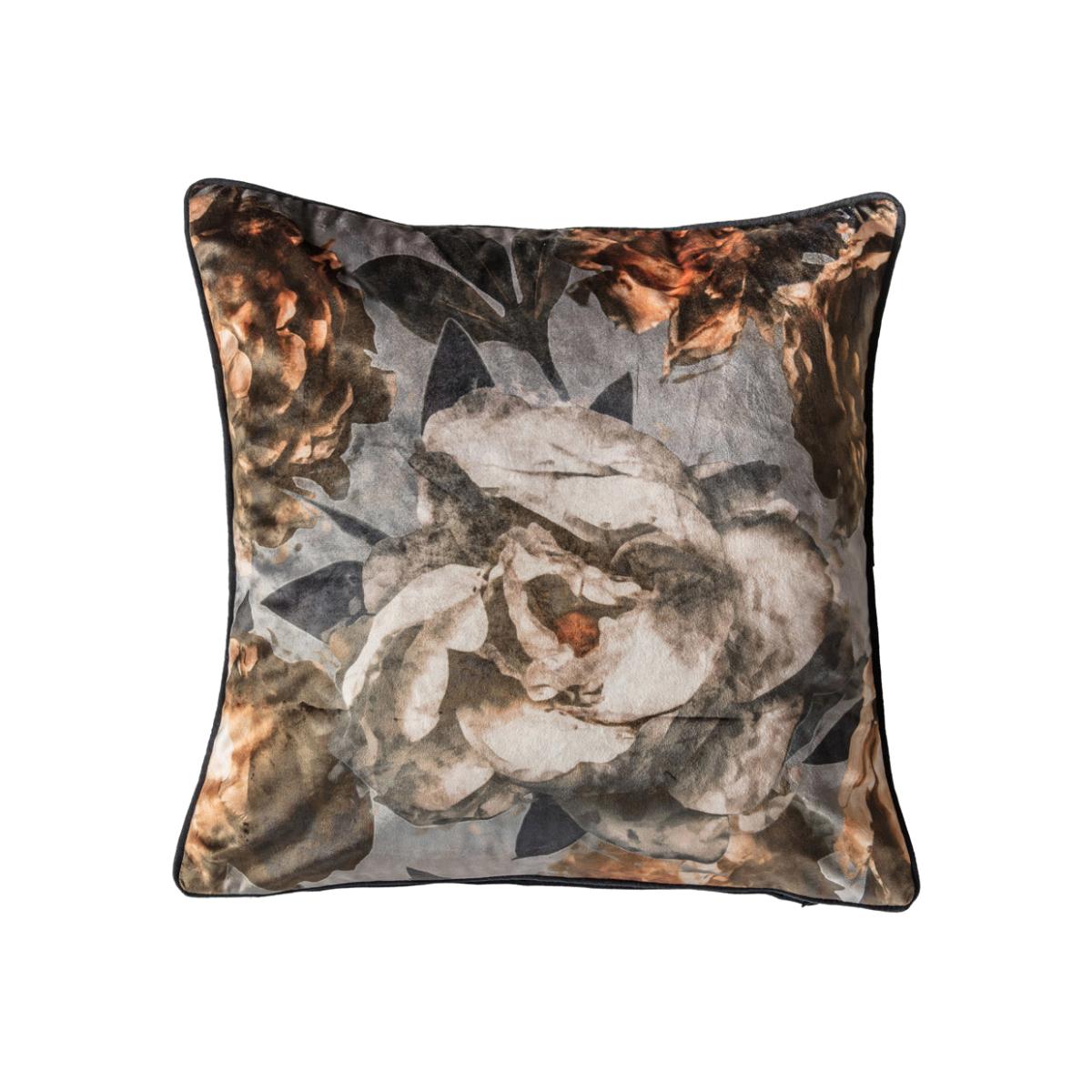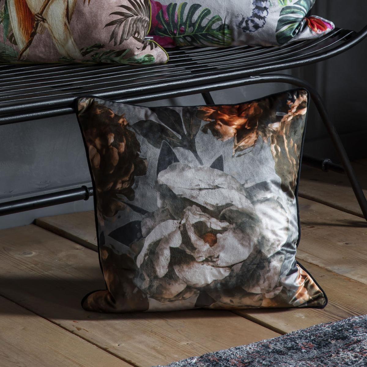 Vintage style design floral printed cushion in luxury oyster and black tones, perfect for adding a touch of chic to an interior.