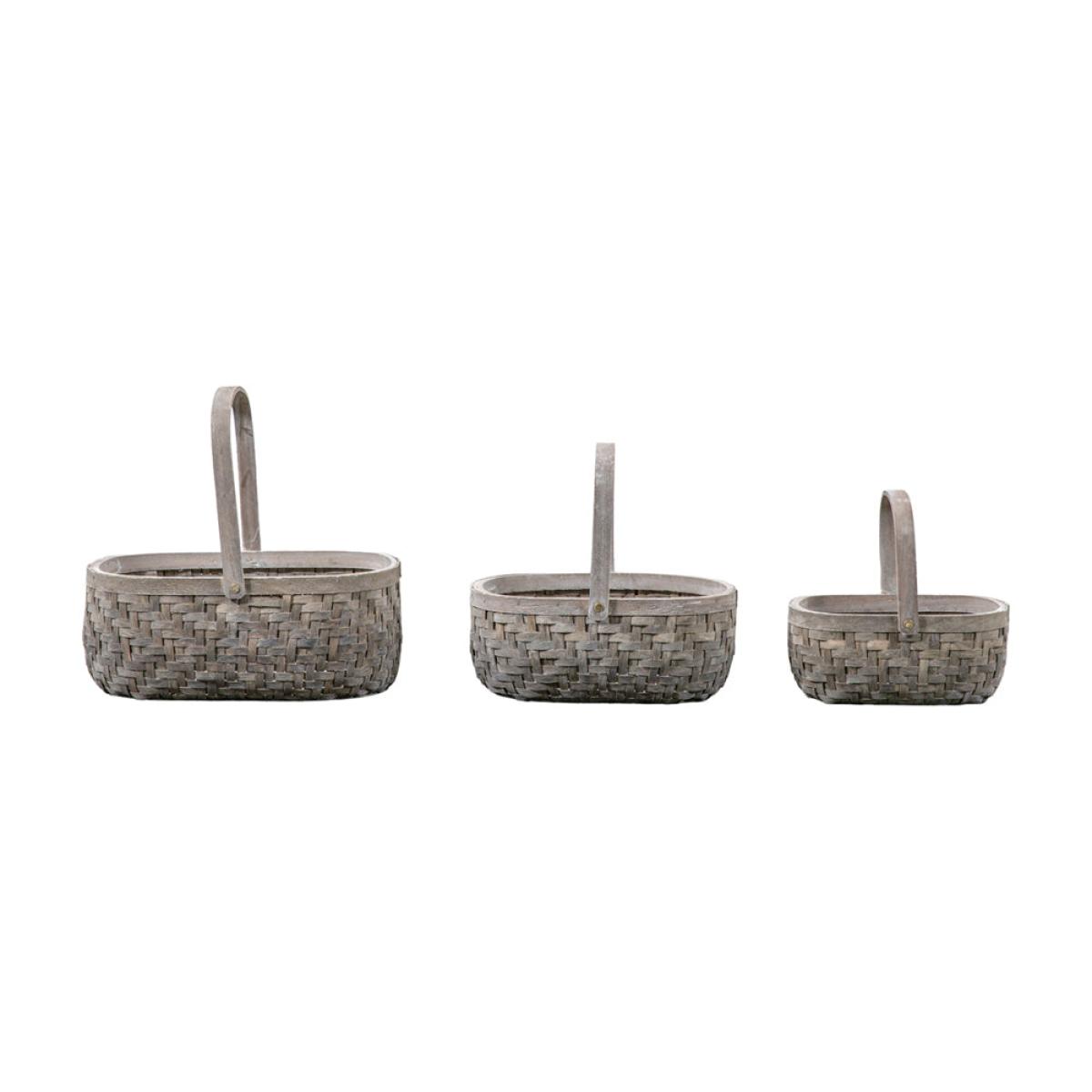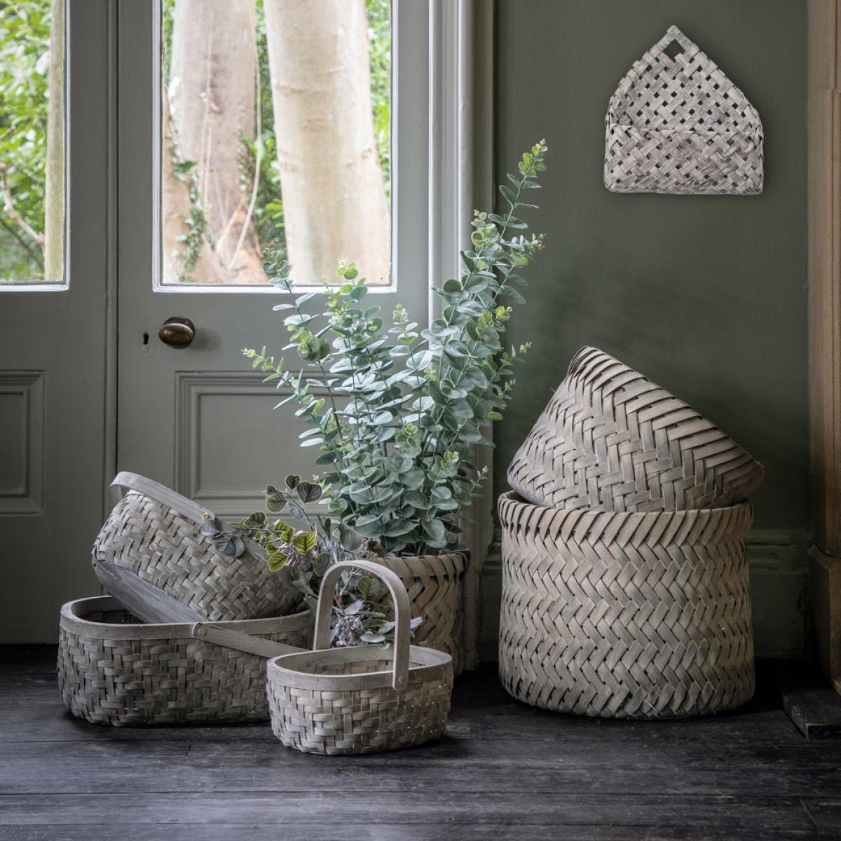These beautiful set of three hamper style baskets feature a charming woven design in a dusky grey colour giving rustic charm. The three hampers also feature a sturdy handle for style and convenienc. View More. These beautiful set of three hamper style baskets feature a charming woven design in a dusky grey colour giving rustic charm. The three hampers also feature a sturdy handle for style and convenience. The three different sizes allows them to be used in a variety of ways, making them a valuable piece to any room.