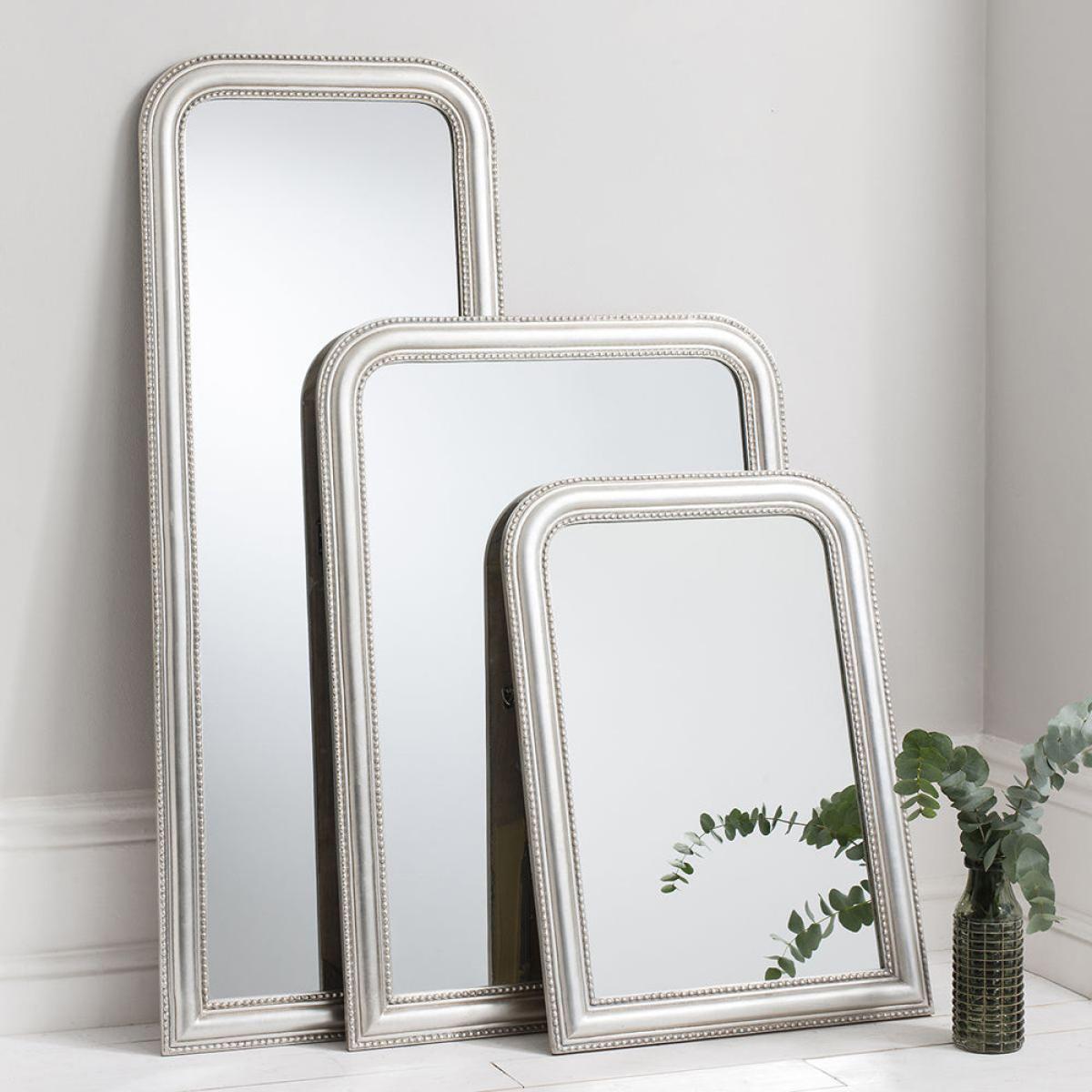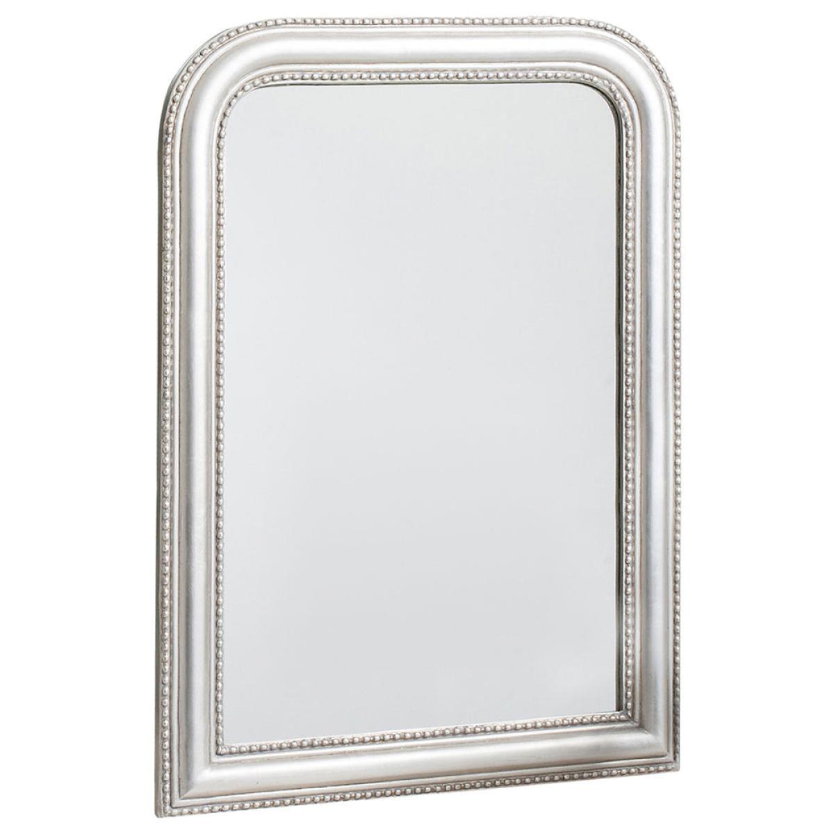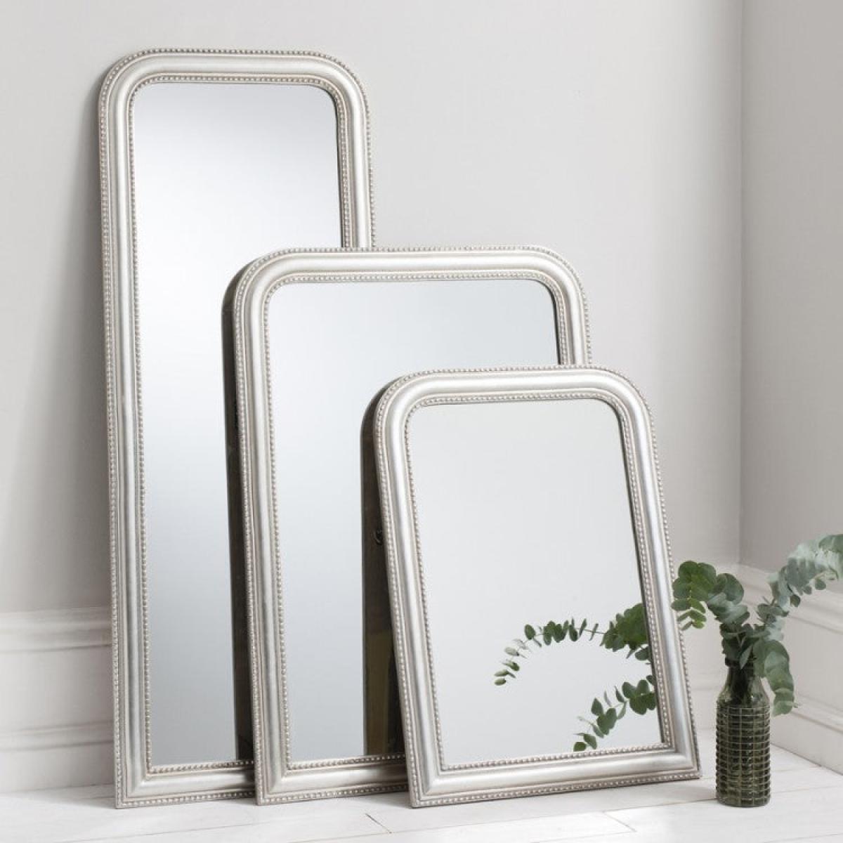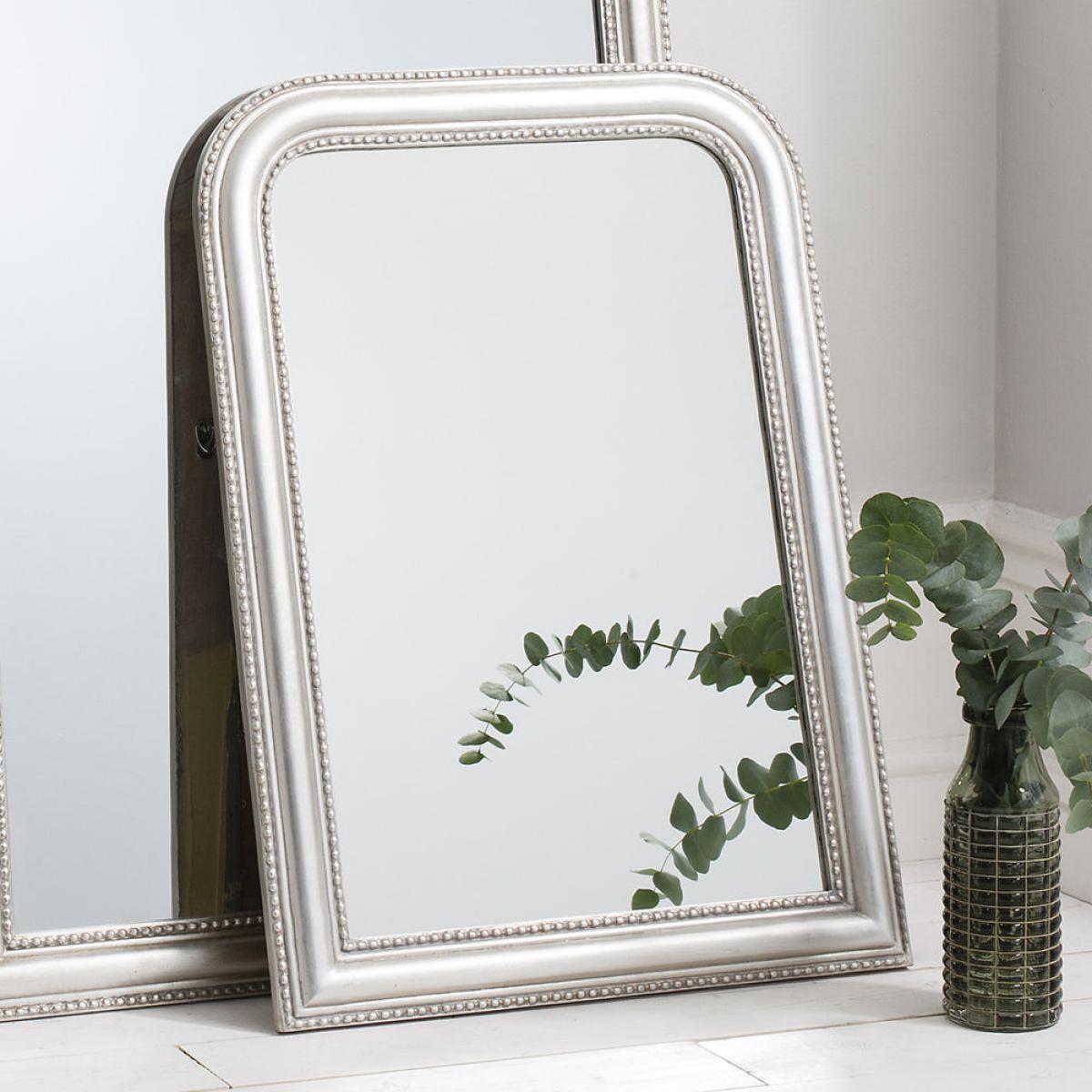 Beautiful solid wood French mirror with beading detail finished in a bright silver leaf. Dimensions:W:56 x H:84 cm