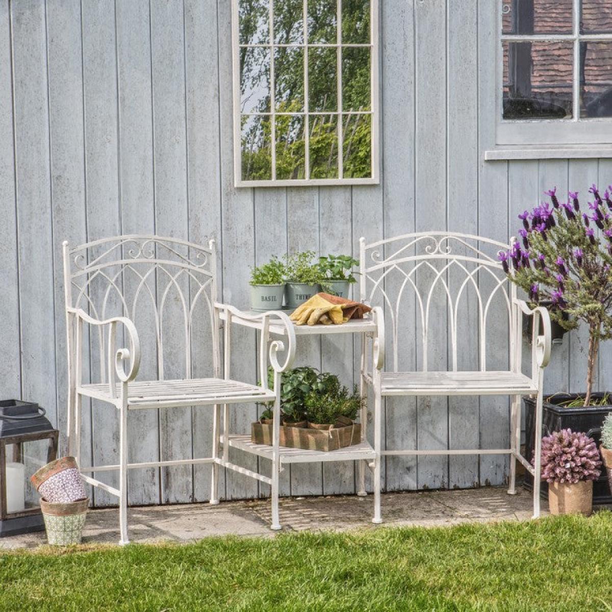 Create a beautiful casual seating area in your garden with the Lavoro loveseat in a distressed, painted grey finish. Featuring two armchairs secured together in the middle with a tapered side table. View More. Create a beautiful casual seating area in your garden with the Lavoro loveseat in a distressed, painted grey finish. Featuring two armchairs secured together in the middle with a tapered side table which has a practical parasol hole for those sunny days. Please note this product is designed for outdoor use and will age naturally due to the additional elements found in an exterior environment, resulting in a natural patina.