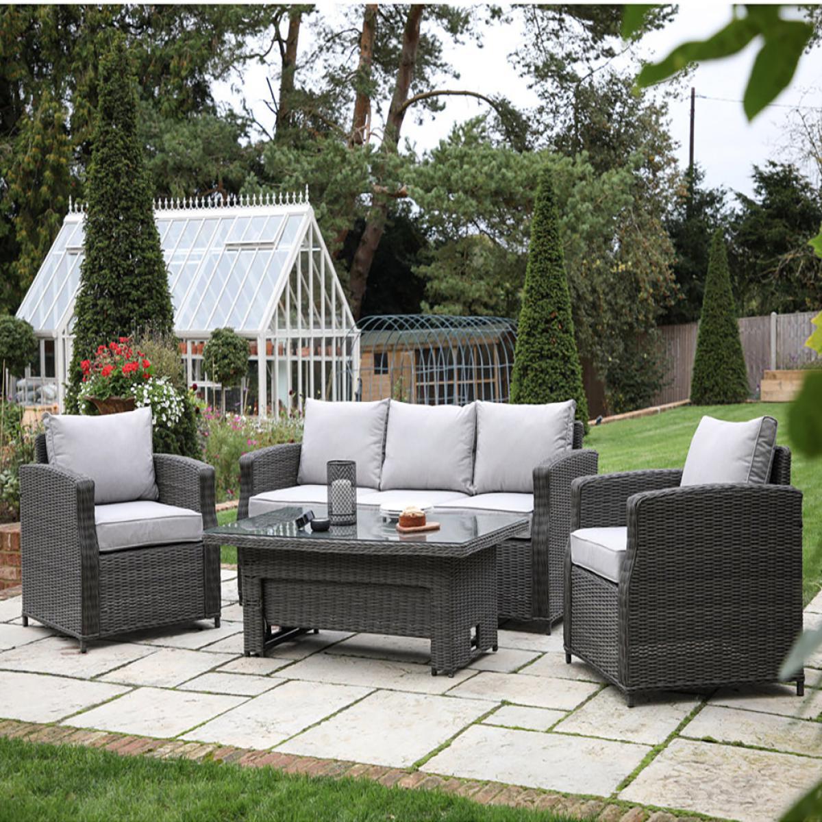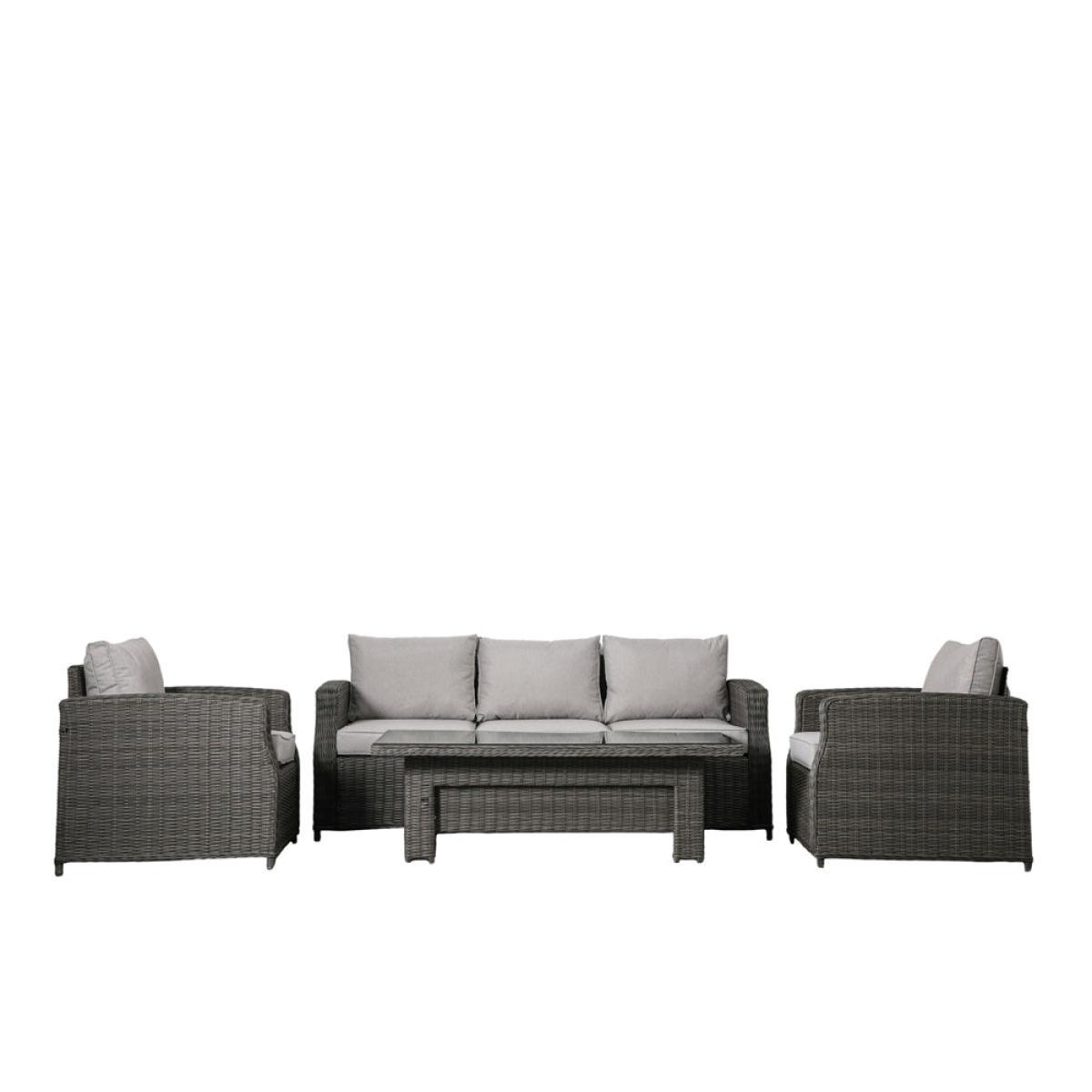This 3 Seater Sofa Dining Set Rising Table, which features a 3-seater sofa, two armchairs and a riser table, is ideal for both eating and relaxing. The table offers an innovative design feature which allows it to be used as a dining table or it can be easily lowered for use as a coffee table. All pieces are crafted from all weather 5mm PE rattan with a hand woven mixed half round/full round weave in a washed grey finish. For comfort, the sofa and chairs have luxurious showerproof cushions in a soft grey colour to complement the colour of the rattan. The frames are powder coated aluminium and the table top is tempered glass. The set is also available in a natural finish. The collection offers a great range of pieces, so you can select the ones to suit your requirements. *Moot Trading Ltd is not a lender and acts only as an introducer. The credit product is provided by Klarna Bank AB (publ). Credit is only available to permanent UK residents aged 18 and over, subject to status. Terms and conditions apply. Please note that the following products are not regulated by the FCA: Pay in 30 days and Pay in 3 instalments. Read More.