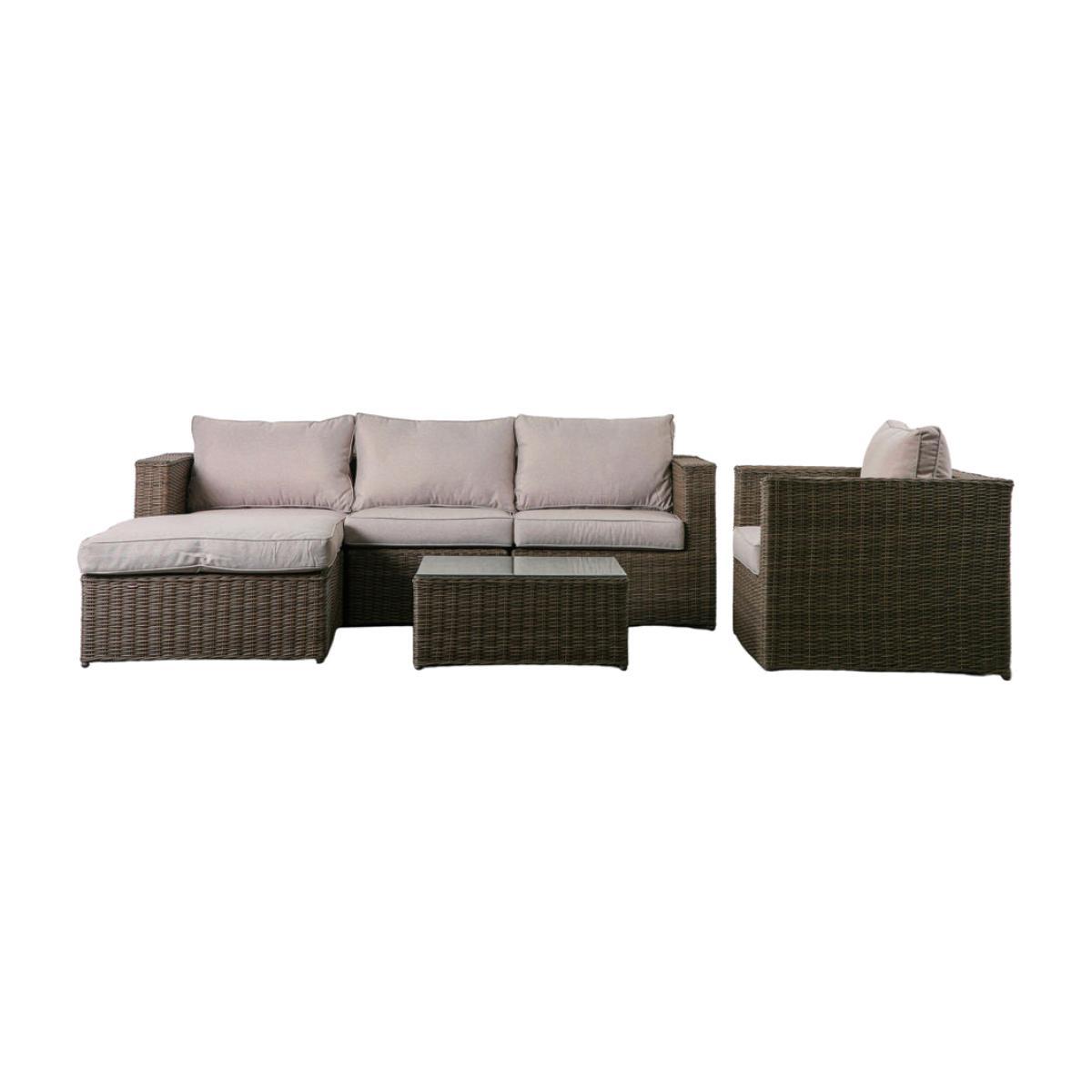 This Chaise Sofa and Chair Set features a modular sofa, comprising two corner units, a middle unit and an ottoman to create the chaise part of the sofa, along with an armchair and coffee table. The ottoman can be positioned at either end of the sofa. All are crafted from all weather 5mm PE rattan with a hand woven mixed half round/full round weave in a natural finish. For comfort, the sofa and armchair have luxurious showerproof cushions in a soft neutral colour to complement the colour of the rattan. The frames are powder coated aluminium and the table top is tempered glass. The chaise sofa and chair set is also available in a washed grey finish. The collection offers a great range of pieces, so you can select the ones to suit your requirements. *Moot Trading Ltd is not a lender and acts only as an introducer. The credit product is provided by Klarna Bank AB (publ). Credit is only available to permanent UK residents aged 18 and over, subject to status. Terms and conditions apply. Please note that the following products are not regulated by the FCA: Pay in 30 days and Pay in 3 instalments. Read More.