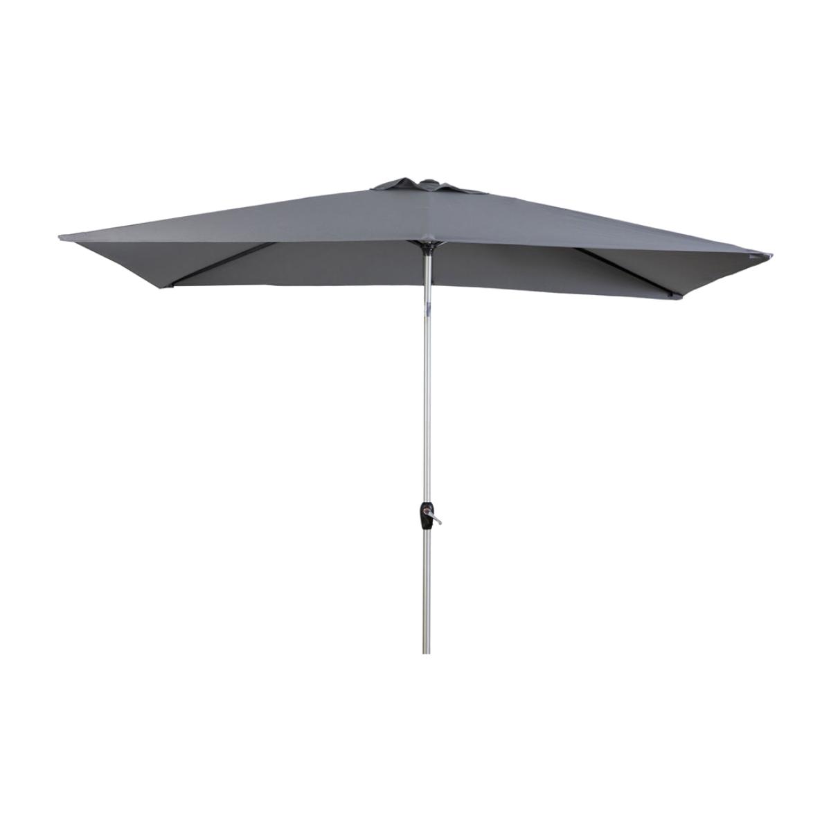 This 2x3m Parasol offers an unusual rectangular design. It features a tilt and crank mechanism, for easy adjustment of the parasol. The lovely grey shade offers a subtle neutral colour to suit a any garden. The frame is aluminium. A base is available for use with the parasol.