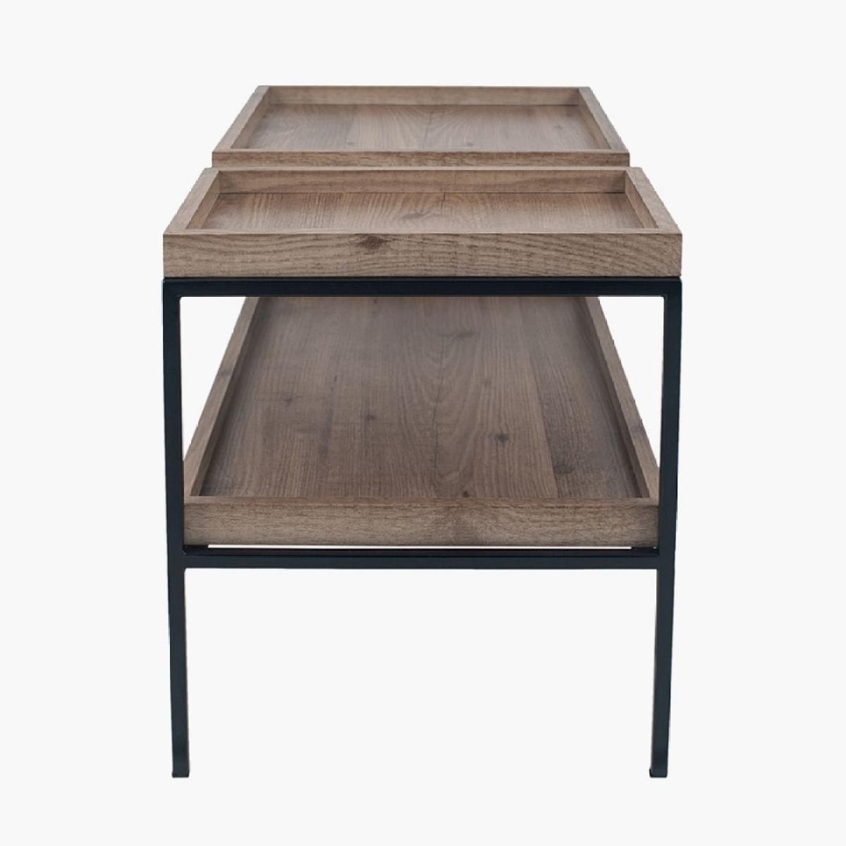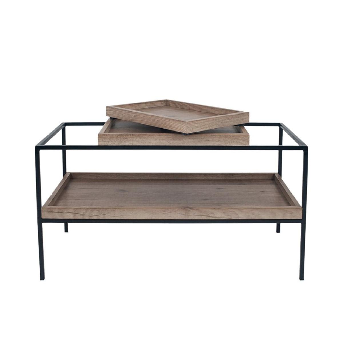 Gallery coffee table, featuring a matte black metal frame and natural wood veneer shelves. A perfect blend of modern design and natural charm, this elegant coffee table features a sturdy matte black metal frame that provides a sleek and contemporary look. The frame's clean lines and minimalist aesthetic enhance the table's overall appeal, making it a versatile addition to any living space. The natural wood veneer shelves add a touch of warmth and organic beauty, offering a striking contrast to the matte black metal. While the bottom shelf is fixed, the two top shelves are removable, making this coffee table extremely versatile and catering for all your storage needs. These shelves provide ample space for displaying books, decorative items or holding beverages and snacks, making the Gallery coffee table as functional as it is stylish. Ideal for living rooms, this coffee table combines practicality with chic design. Gallery coffee table, featuring a matte black metal frame and natural wood veneer shelves. A perfect blend of modern design and natural charm, this elegant coffee table features a sturdy matte black metal frame that provides a sleek and contemporary look. The frame's clean lines and minimalist aesthetic enhance the table's overall appeal, making it a versatile addition to any living space. The natural wood veneer shelves add a touch of warmth and organic beauty, offering a striking contrast to the matte black metal. While the bottom shelf is fixed, the two top shelves are removable, making this coffee table extremely versatile and catering for all your storage needs. These shelves provide ample space for displaying books, decorative items or holding beverages and snacks, making the Gallery coffee table as functional as it is stylish. Ideal for living rooms, this coffee table combines practicality with chic design.