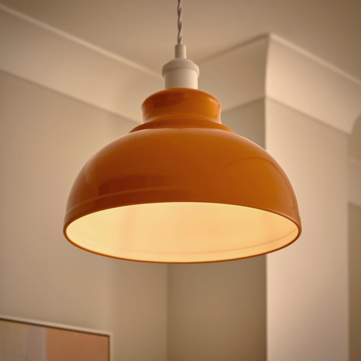 Introduce a retro feel to your home with this ochre dome shaped ceiling pendant, perfect for adding a burst of colour to your interior. This timeless metal ceiling fitting will easily attach onto your existing light fitting and will add brightness to any interior space. Easy Fit pendants are ideal for a quick style change without needing an electrician. Simply assemble on to your existing ceiling fitting, and you’re good to go within minutes! Don’t forget to choose the correct bulb for your ceiling fitting.
