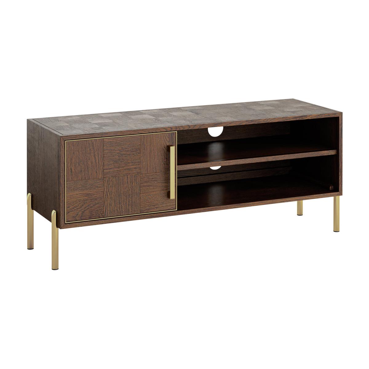 * Geometric Design* Oak Frame* Gold Legs* 1 Large Cupboard and shelving Compact yet impactful, the Gambit Small TV Unit brings together premium materials and geometric sophistication. Perfect for smaller living spaces, this unit offers ample storage for your media essentials while adding a contemporary flair to your home decor. Please note we are unable to deliver this item to Northern Ireland.