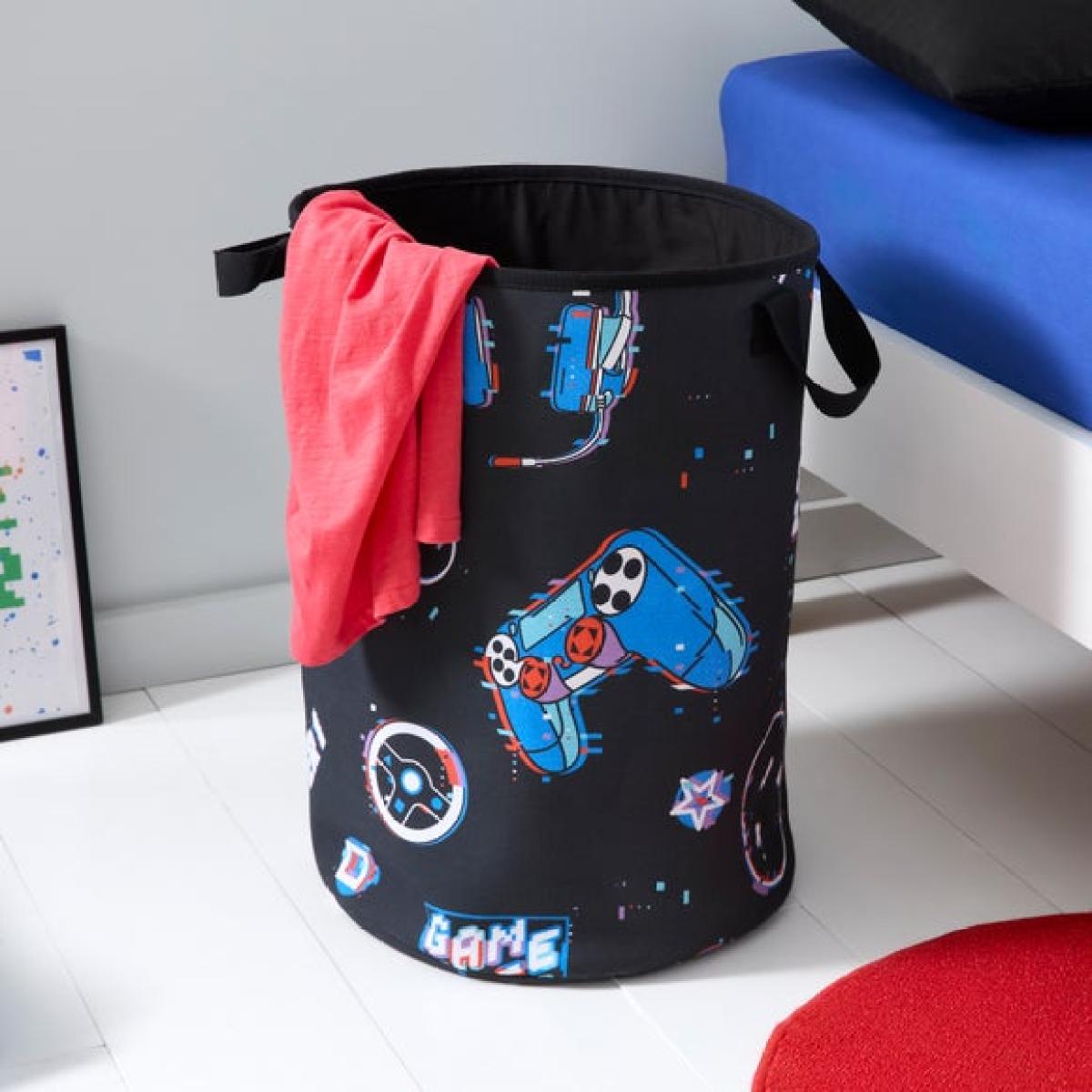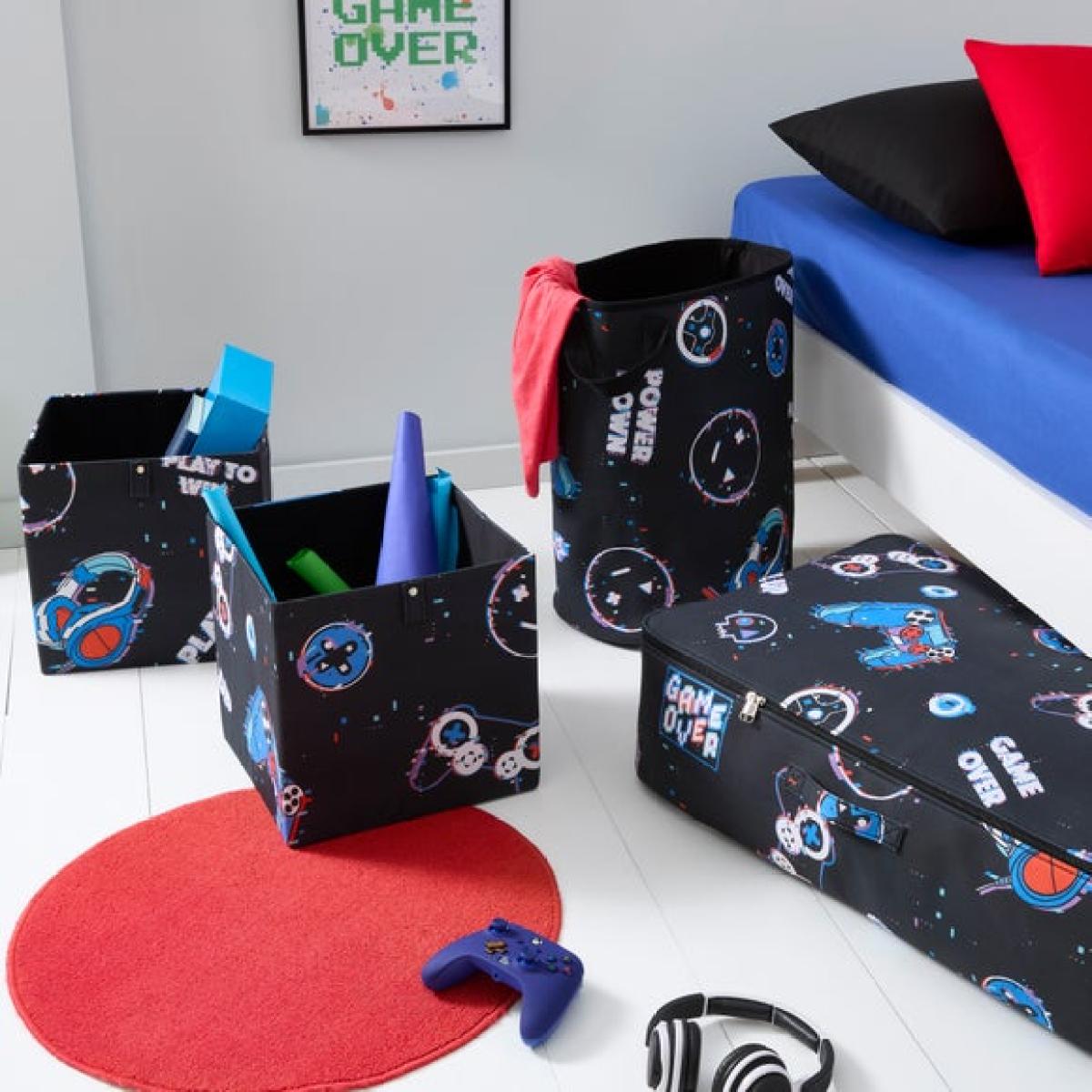 * Gamer-inspired design * Made from cotton canvas * Folds flat for easy storage * Matching items also available Tidy up in game mode with the Game Over toy storage bag. Made from 100% cotton canvas, it’s tough enough for daily use and light enough to carry from room to room. The bold gamer design brings a playful touch to bedrooms and play areas. Built-in handles make it easy to move, even when full. When it’s not in use, it folds down flat for simple storage.