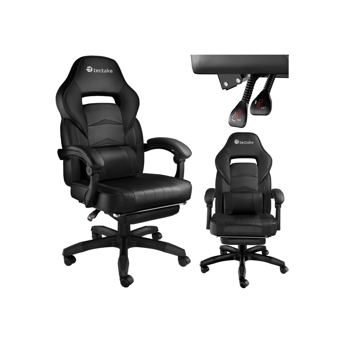 With the versatile gaming chair Comodo from tectake, you are well-prepared for long gaming sessions and demanding work projects at your computer desk. The thick padding, ergonomic shape, continuous height adjustment, adjustable backrest and fold-out footrest offer great comfort. Designed to support your body with its comfortable design, it's easy to use and set up and can support weight up to 120 kg. With its stylish striped pattern and chic imitation leather cover, the two-tone gaming chair will also fit any gamer aesthetic. The swivel base and the free-running double castors give the lightweight seat a high degree of accessibility and make it a perfect addition to any home, office, or gaming set up desk.