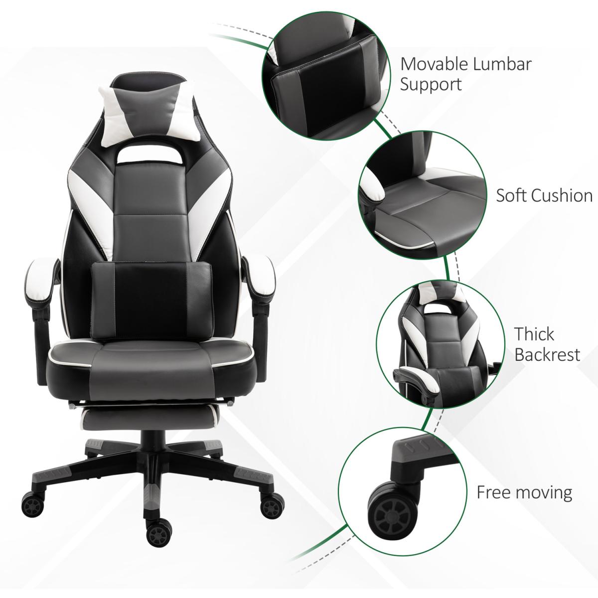 Sink yourself into comfort like never felt before with this gaming chair with a footrest from Vinsetto. It has all the classic features - padding, high back, armrests, a five-wheel base - but with everything ramped up to the extreme. Thick sponge for enduring comfort, this piece is made with a manual footrest that can be pulled out and pushed back in, with a removable headrest and pillow included. These gaming chairs for adults are finished with smooth PU leather in a modern colour design.