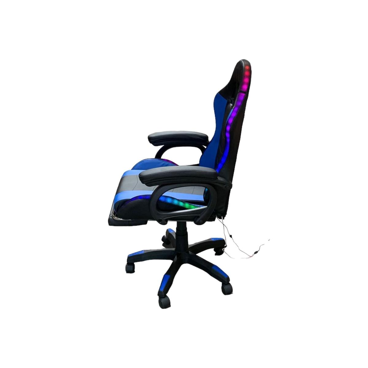 This gaming chair offers the perfect combination of comfort, style, and functionality. It is upholstered in high-quality PU leather, providing a sleek and luxurious look. The chair comes with an attached footrest, allowing you to relax and elevate your legs for added comfort during long work or gaming sessions. With a 135-degree reclining feature, you can find the ideal angle for relaxation or focus. The chair also features a 360-degree swivel, allowing easy movement and flexibility. Its adjustable height ensures proper ergonomic alignment for your specific preferences. Adding to its appeal, the chair is equipped with LED lights that can be controlled using a provided remote control. The color of the lights can be changed according to your mood or preference, creating a vibrant and personalized gaming or work environment. The LED lights operate conveniently via USB, ensuring hassle-free connectivity and power supply.
