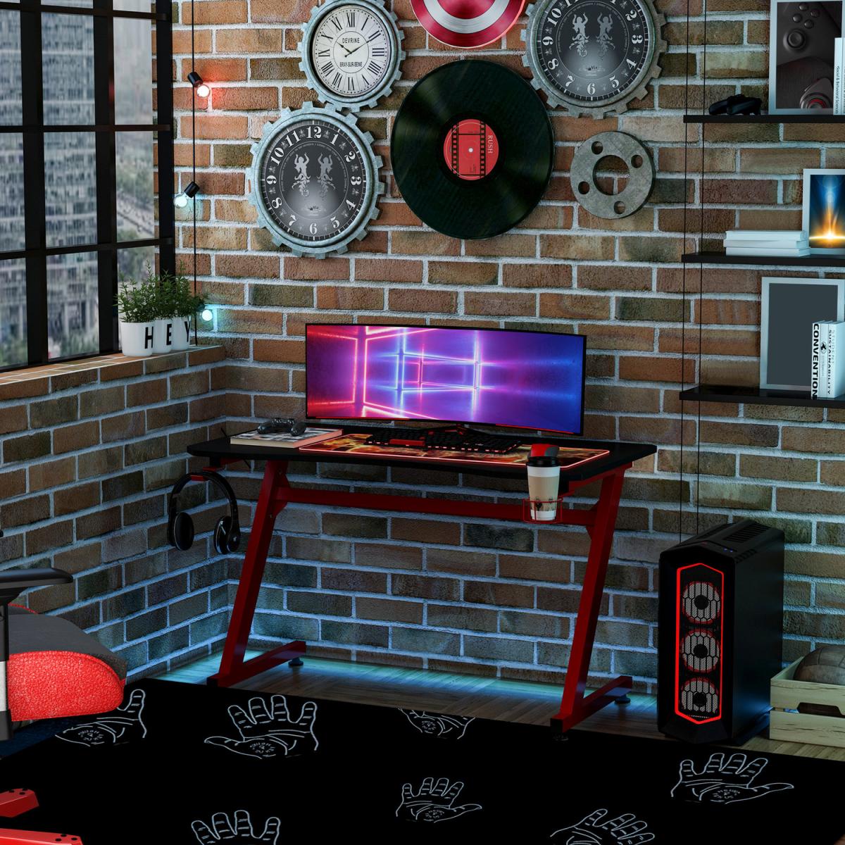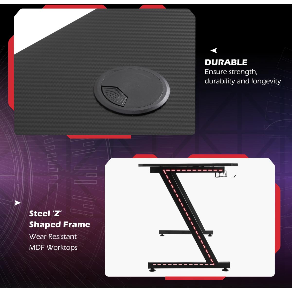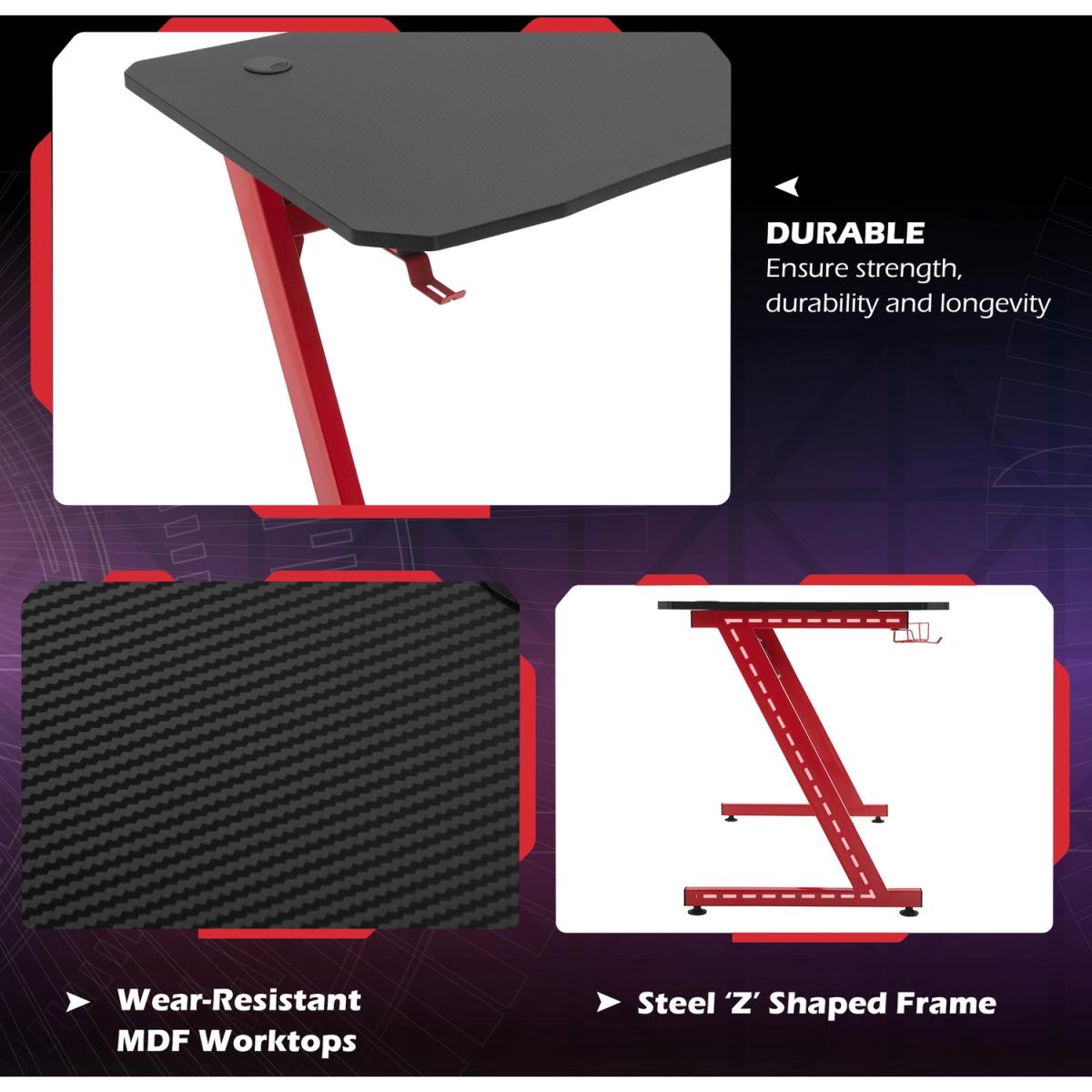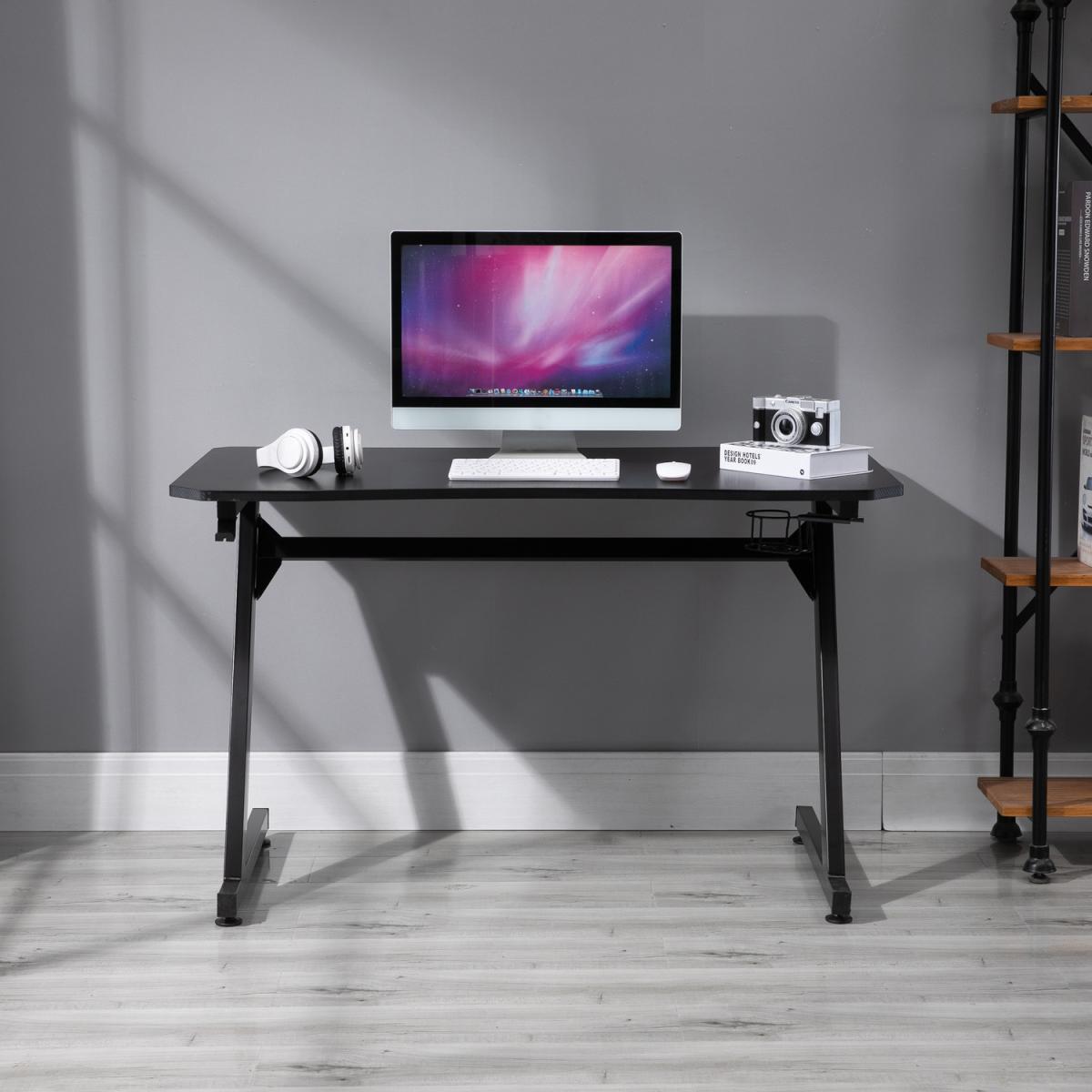 Transform your gaming time with this stylish desk from HOMCOM. Made from particleboard for a durable and reliable structure, it features a large main worktop, a cup holder and a hanging hook, giving you everything you need to keep everything together. Steel legs keep the balance in check, and adjustable feet ensure this desk will be balanced even on unsteady ground. It's finished with a cable organiser on the back so the wires keep untangled and out of your way. A must-have piece for your own gaming heaven.