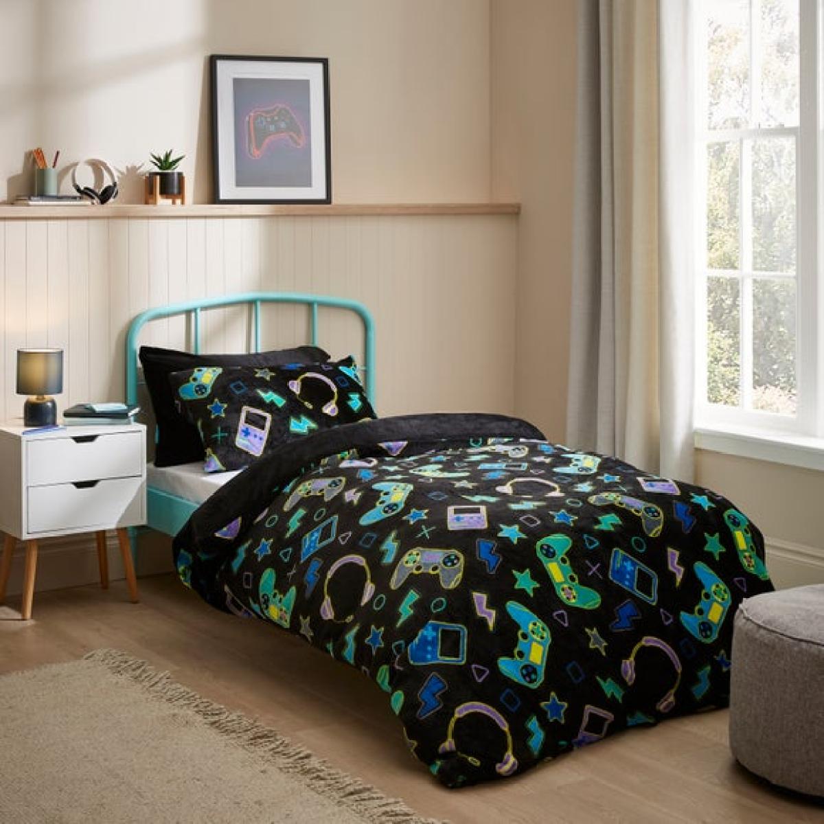 I love this gaming fleece duvet cover for adding a fun, modern touch to a child's bedroom or playroom. Its bold, colourful design works particularly well in contemporary or casual interiors, creating a playful vibe that appeals to gaming enthusiasts. For styling tips, pair it with neutral or plain accessories to let the bedding stand out, and keep the rest of the room minimal to avoid visual clutter. It’s practical too-easy to grab for a quick change and great for colder nights thanks to the cosy fleece material. This set is a great way to incorporate personality into a space while keeping things functional and comfortable.