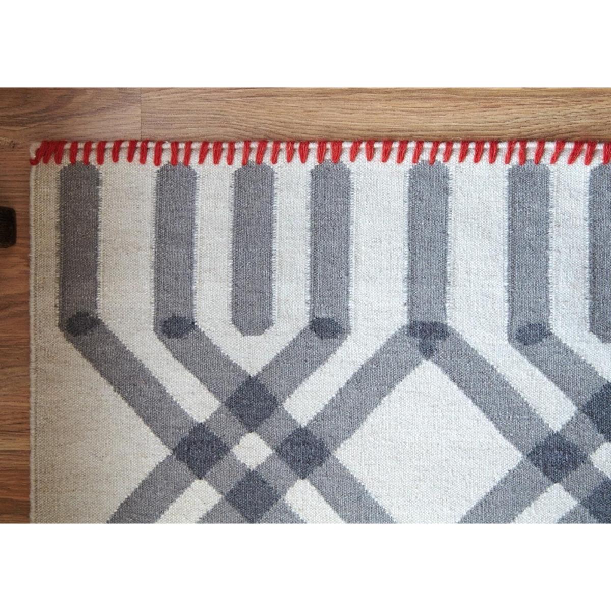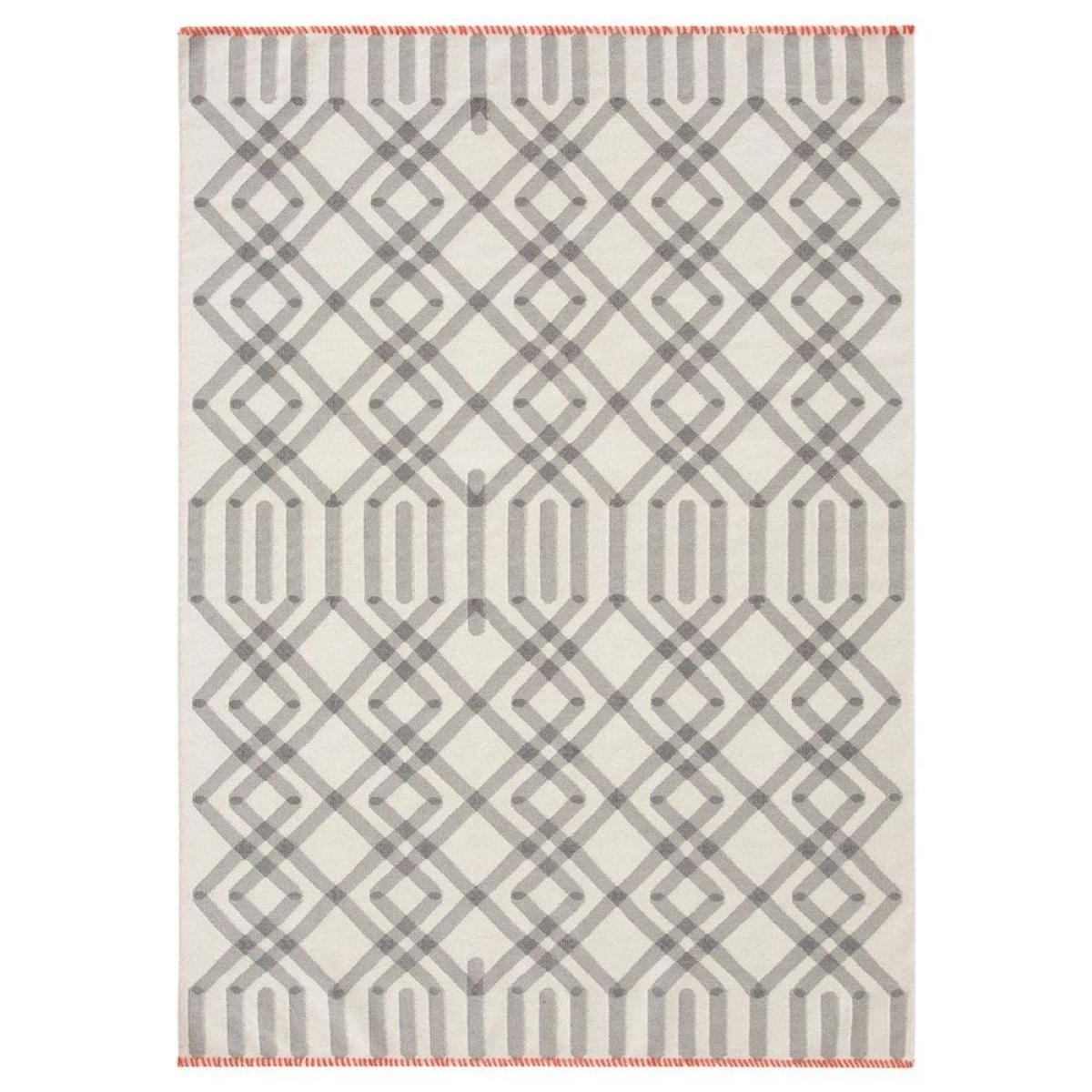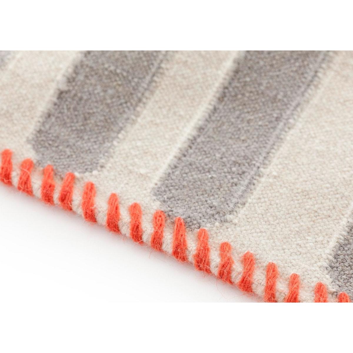 The colours and tones of this rug recall a desert landscape with intense light that shimmers in the heat. The thick grey lines evoke watercolour paintings when different grades of transparencies are layered together. The orange stitched edge completes the rug adds to the fresh and modern feel. Perfect addition to your kitchen or living room