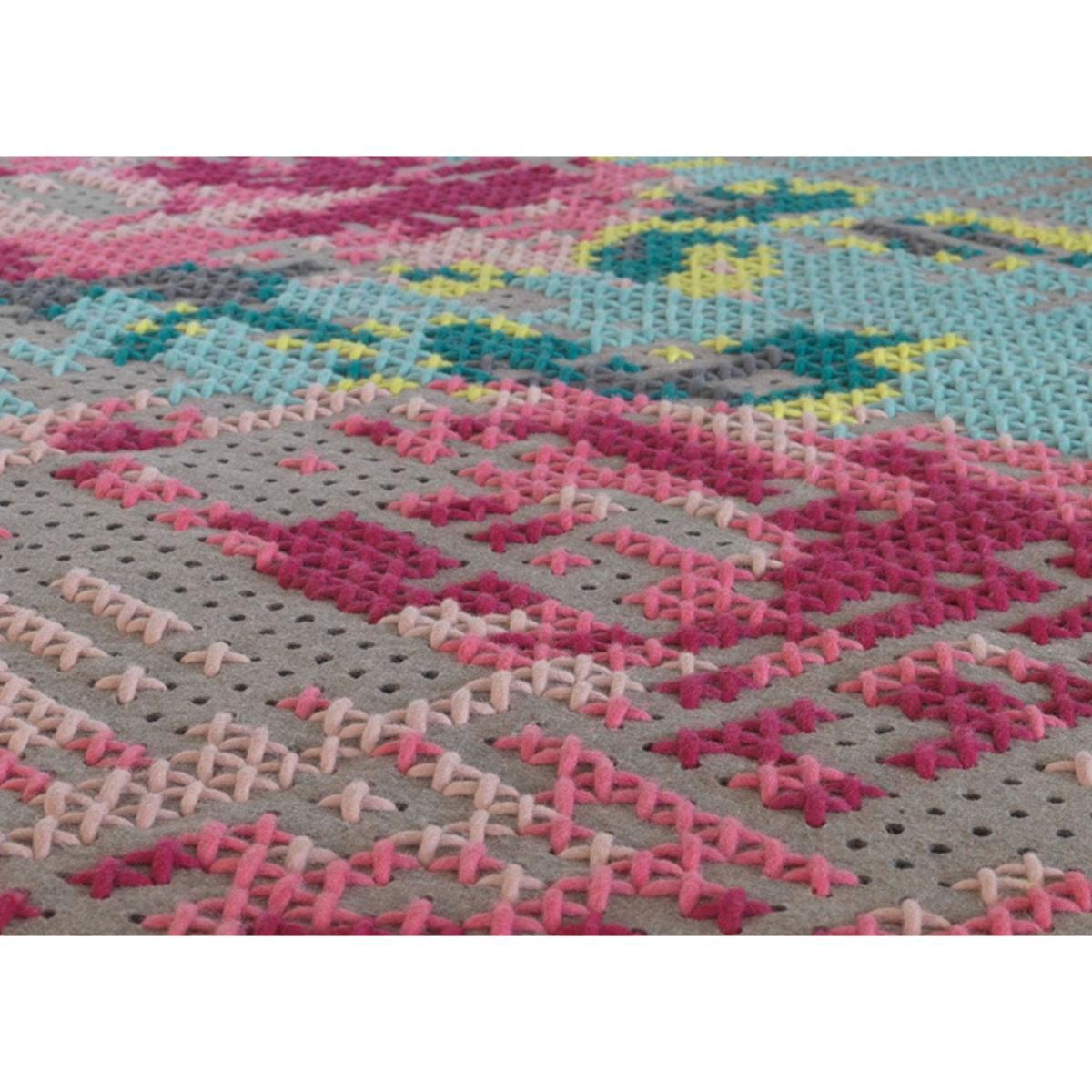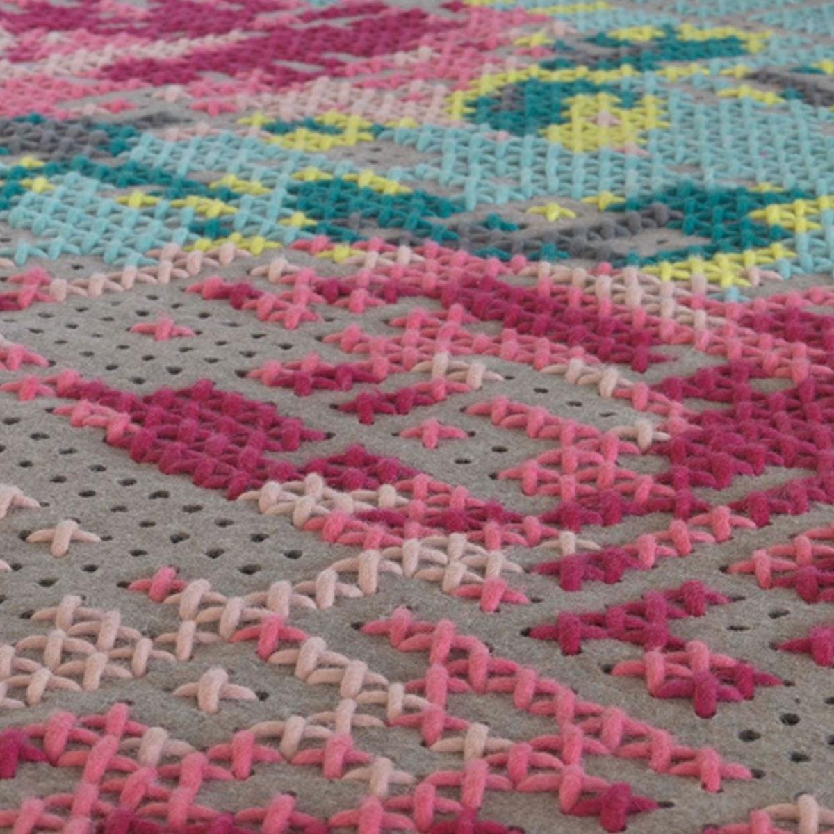 Renowned for producing unique rugs, the Canevas is designed in Spain by Gandia Blasco before it is hand woven by specialist Indian craftsmen using the latest techniques. This abstract cross-stitch rug is woven from pure wool, creating a dichotomy between traditional and modern styles. Designed by Charlotte Lancelot, colourful thick threads embellish a perforated soft felt backing in a contrasting earthy tone.