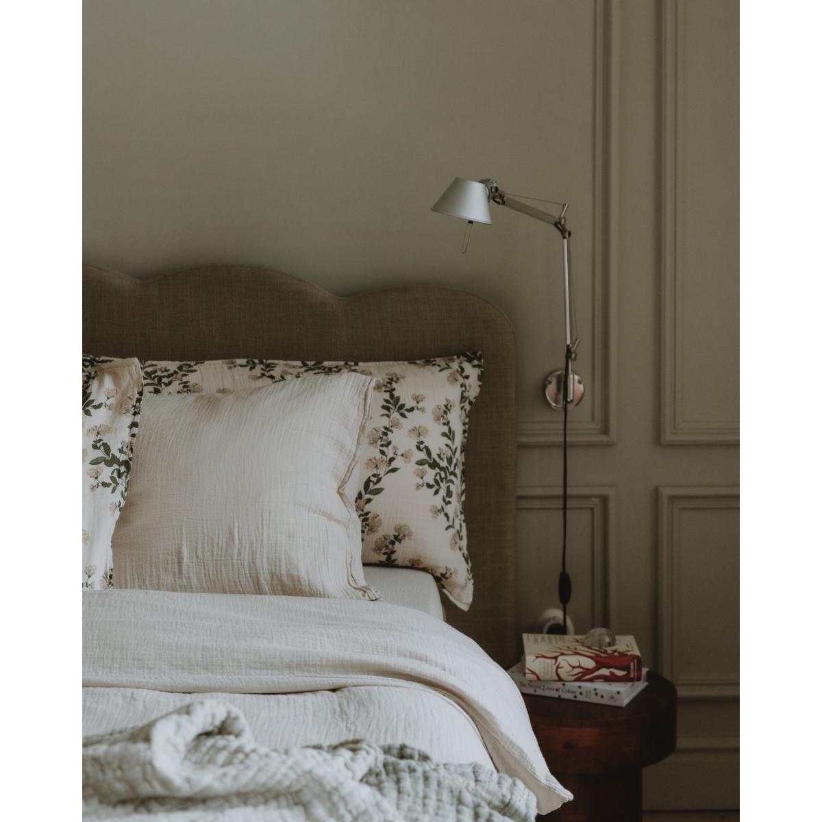 I love this pillowcase because of its delicate muslin fabric and subtle honey-suckle pattern, which adds a soft, timeless touch to a variety of interiors. It works particularly well in bedrooms styled with neutral, muted tones or vintage influences, creating a cosy and restful vibe. For a layered look, pair it with plain linen or quilted bedding, and consider mixing textures for added interest. Practical styling tips include using it as a statement piece on a bed with plain linens, or arranging several in differing sizes and patterns for a curated, relaxed aesthetic. Its understated elegance makes it versatile enough to complement both classic and contemporary interiors.