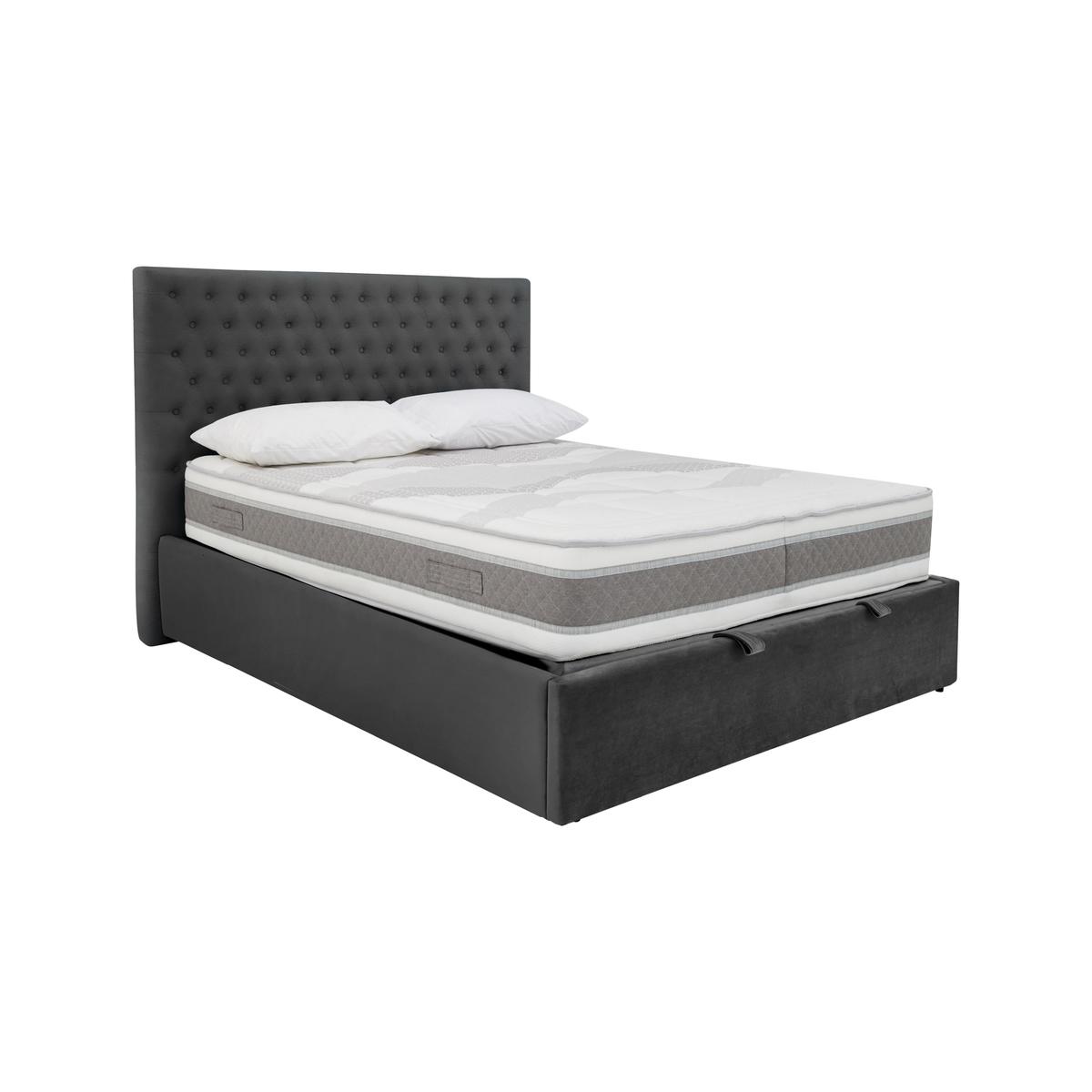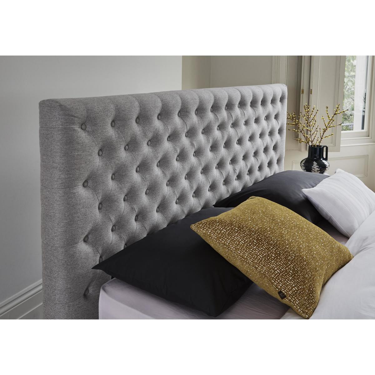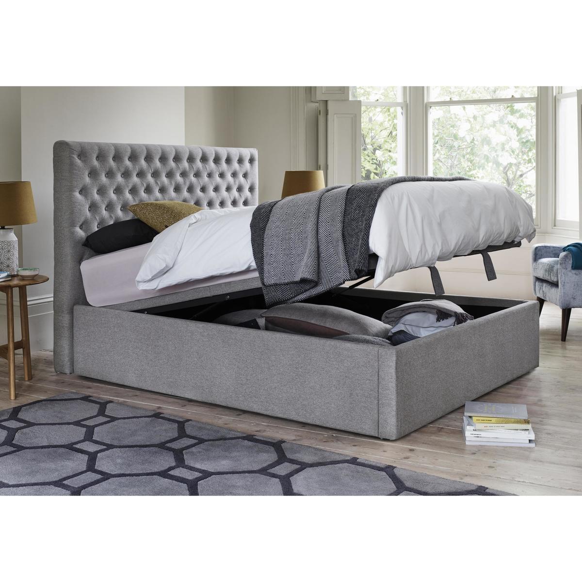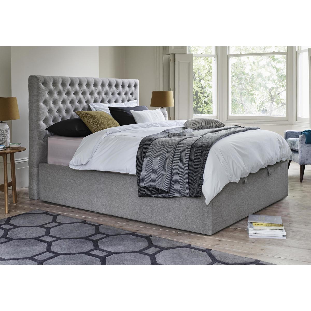 Tall buttoned headboard and spacious ottoman storage. Available for quick delivery. Great value and only at Furniture Village. For all kinds of reasons, the Garcia ottoman bed frame is a one of a kind. Entirely handcrafted, this piece includes both a headboard and a base with huge under bed storage space for one incredible-value price. And what a headboard it is, too. Tall with modern square edges, it features rows and rows of beautifully-executed buttoning. The ottoman base is worth talking about, too. Unusually, there’s no weight restriction (as it rests on the floor) so you really can use it to store absolutely anything. The base is also easy to open and close thanks to the gas-lift mechanism, and rests neatly inside the side rails for a sleek modern look. Designed to accommodate any standard type of mattress, the Garcia ottoman bed frame is offered in double, king and super king bed sizes. Available for quick delivery and only at Furniture Village. Headboard comes as a single piece. Mattress available separately. Top Tip: The flattening and shading of heavy wear areas on pile fabrics like chenille and velvet is unavoidable. Pile fabrics may be vacuumed lightly using the curtain attachment, and brushed regularly in the direction of the pile with a soft brush.