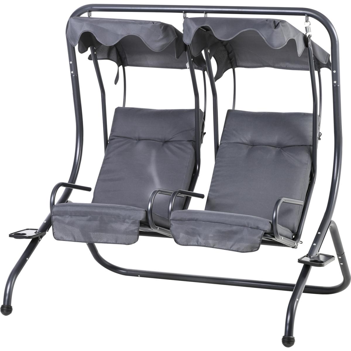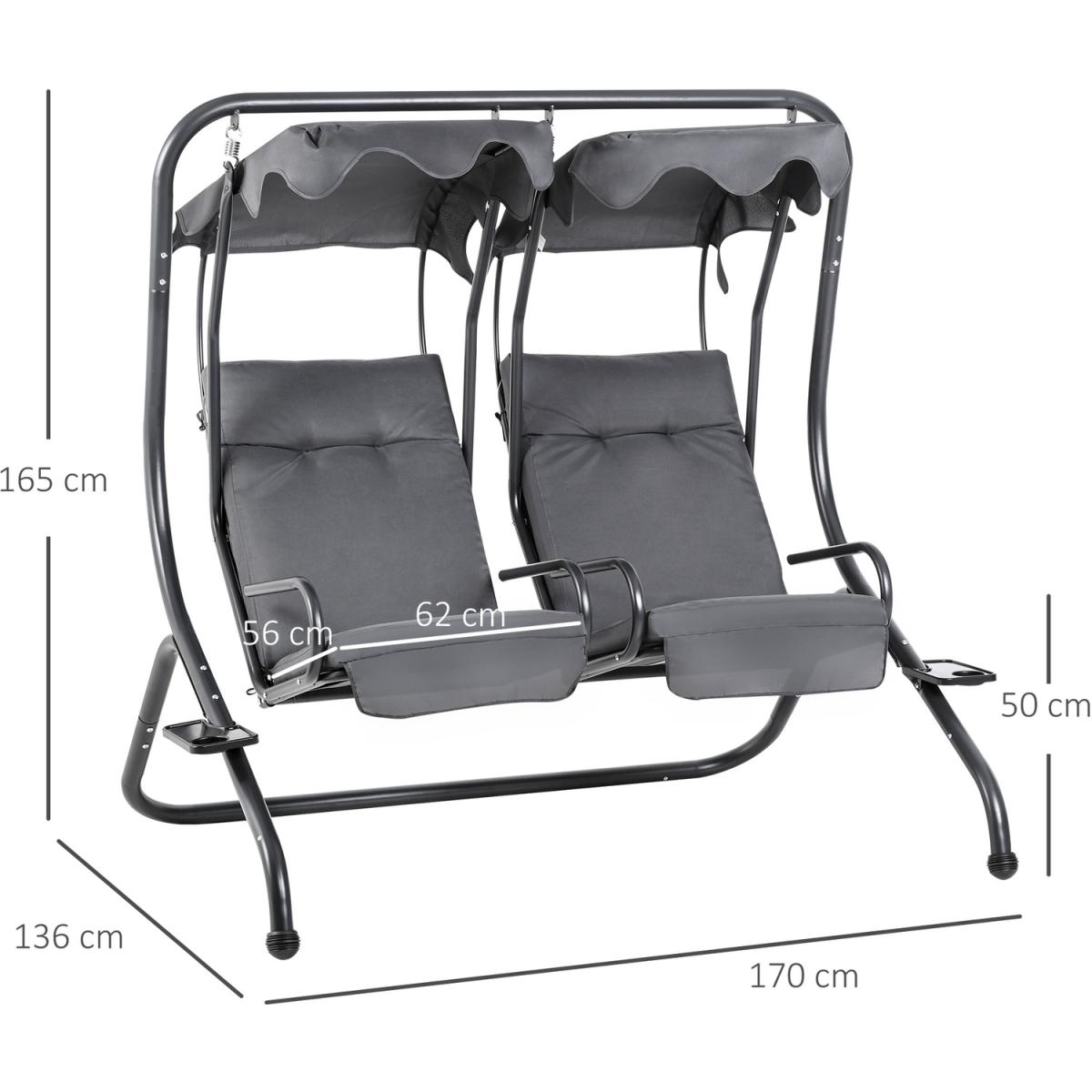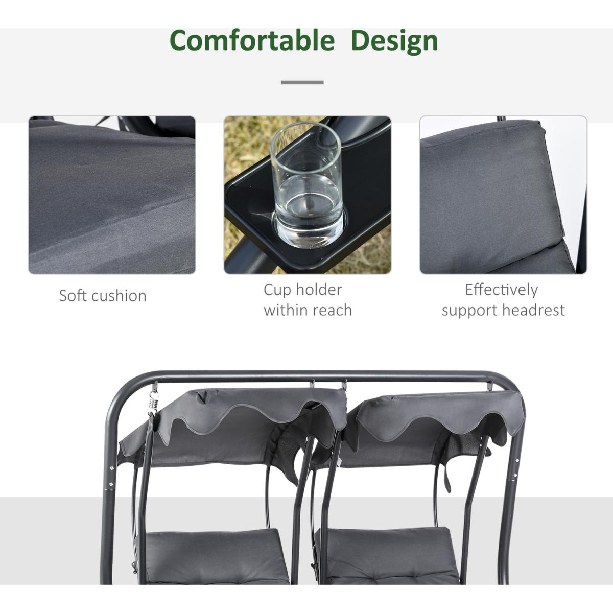 Double the outdoor fun with this two-seat swing chair from Outsunny. Both seats come with a cup holder so you can enjoy your favourite drinking whilst soaking up the sun. The curved steel frame is durable and sturdy, with a large base so it keeps balanced. You'll cherish your summer days even more now with this piece.
