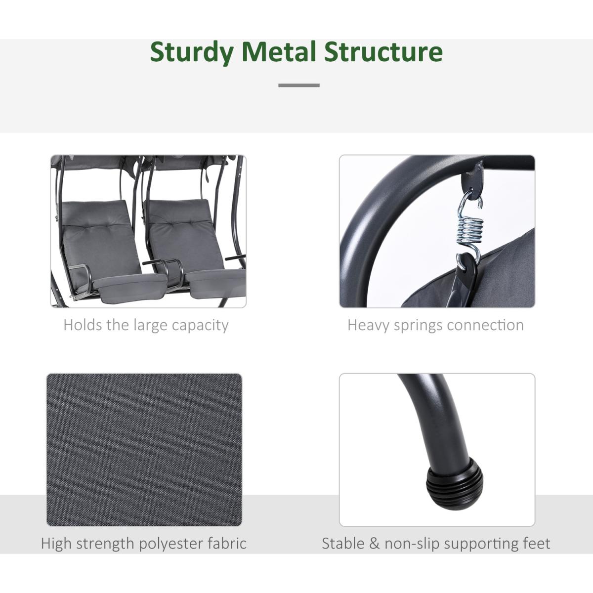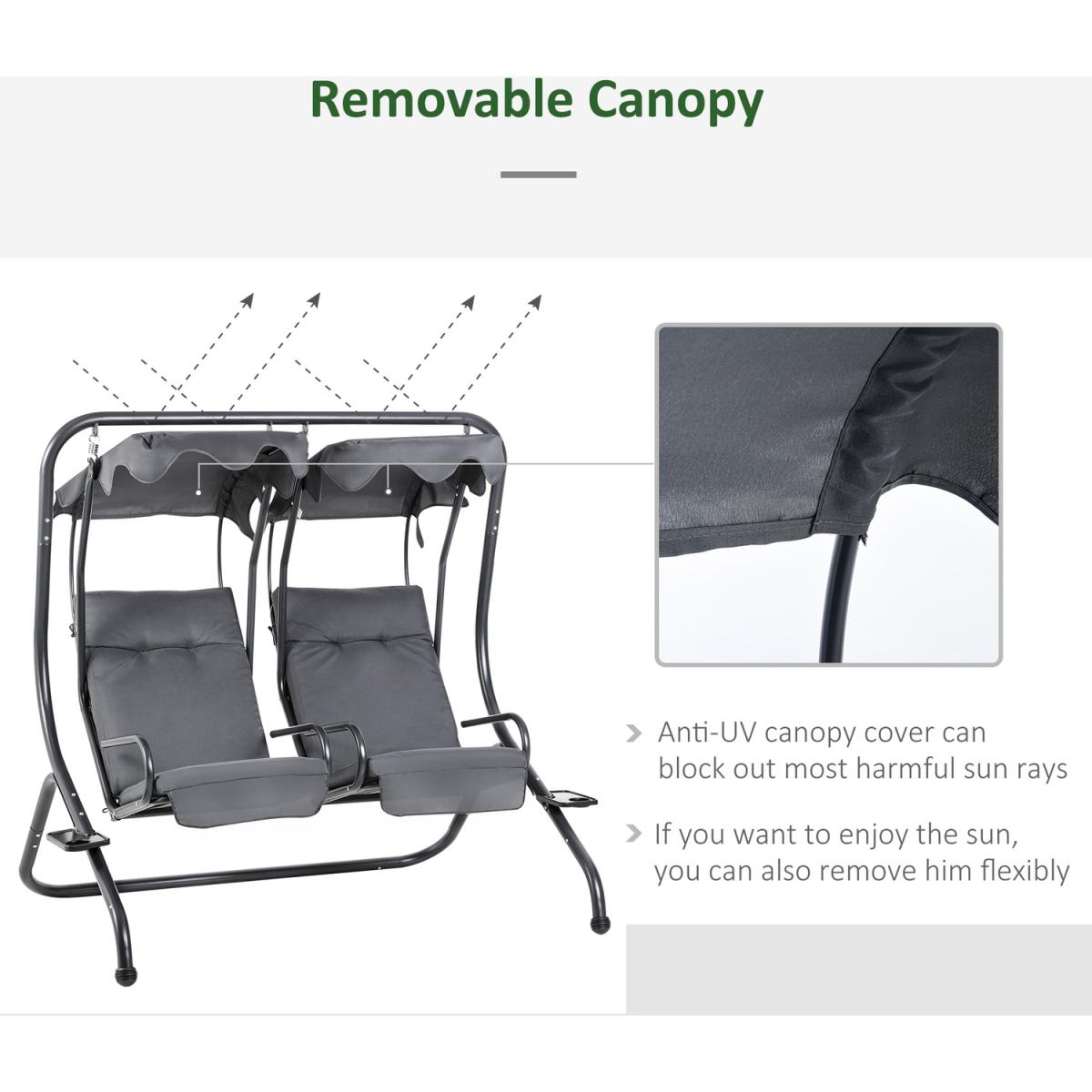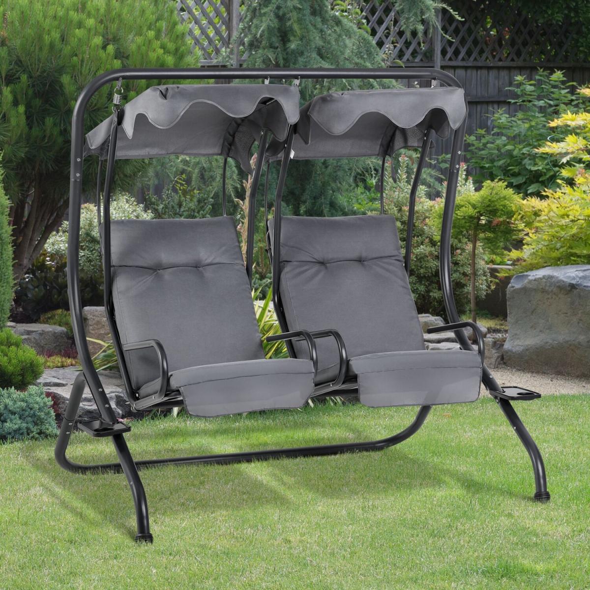 Double the outdoor fun with this two-seat swing chair from Outsunny. Both seats come with a cup holder so you can enjoy your favourite drinking whilst soaking up the sun. The curved steel frame is durable and sturdy, with a large base so it keeps balanced. You'll cherish your summer days even more now with this piece.