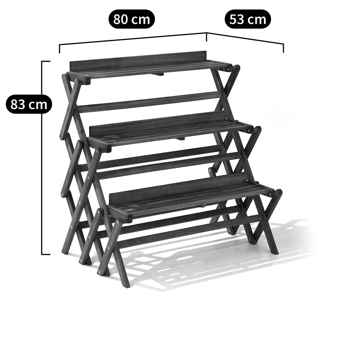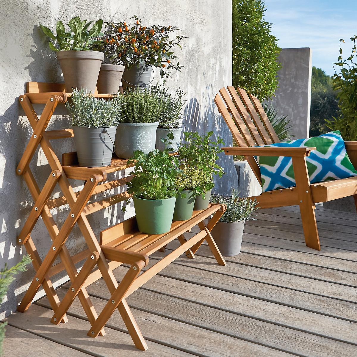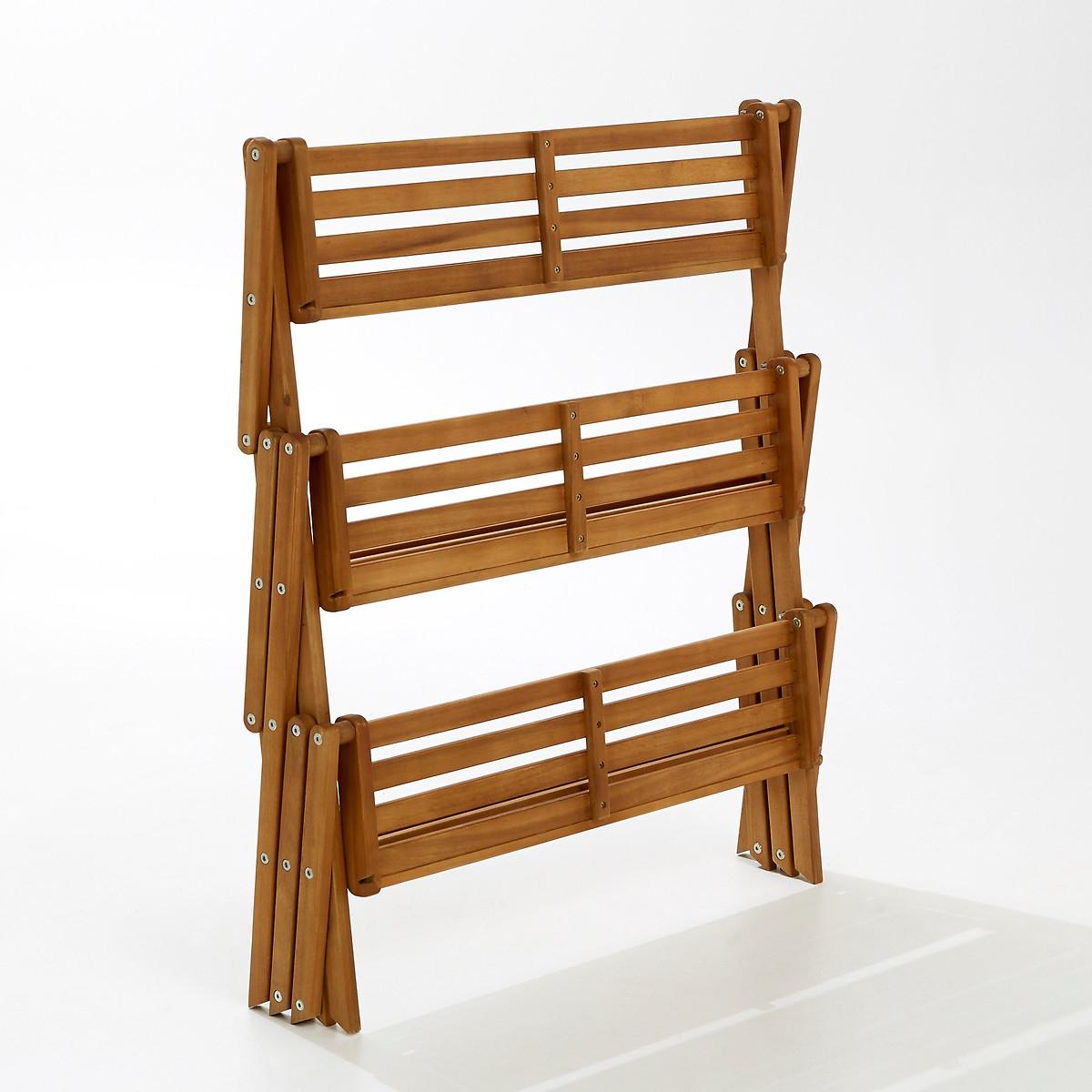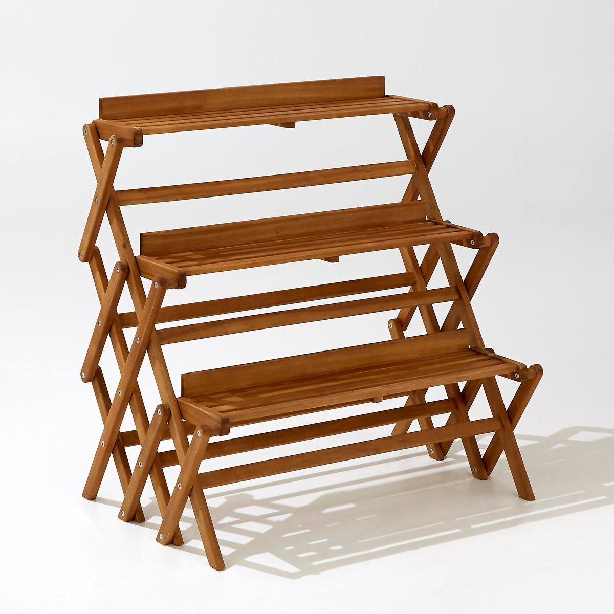 Ideal for your garden or your terrace, this small 3-tier shelf will accommodate your plants as well as your decorative items. Very practical, it folds, moves and stores easily. Product Details • 3-Level Shelf • Can be folded • Acacia stained teak finish. FSC® certified wood Quality Info • Acacia is a wood that offers good mechanical properties (good resistance to insects and fungi) and is resistant to bad weather (alternation of dry and humid periods).Dimensions. Overall • Length 80cm • Width 53cm • Height 83cm. Shelf • Length 78.5cm • Width 16.6cmDelivery:. Sold pre-assembled. Note! Please check that all access points are large enough to accommodate your delivery (doors, stairs, lifts). • WOOD FROM SUSTAINABLY MANAGED FORESTS. FSC® certified wood comes from forests that are environmentally, socially and economically well managed. Parcel dimensions and weight:1 parcel • L97 x H16 x D83cm • 8.5kg
